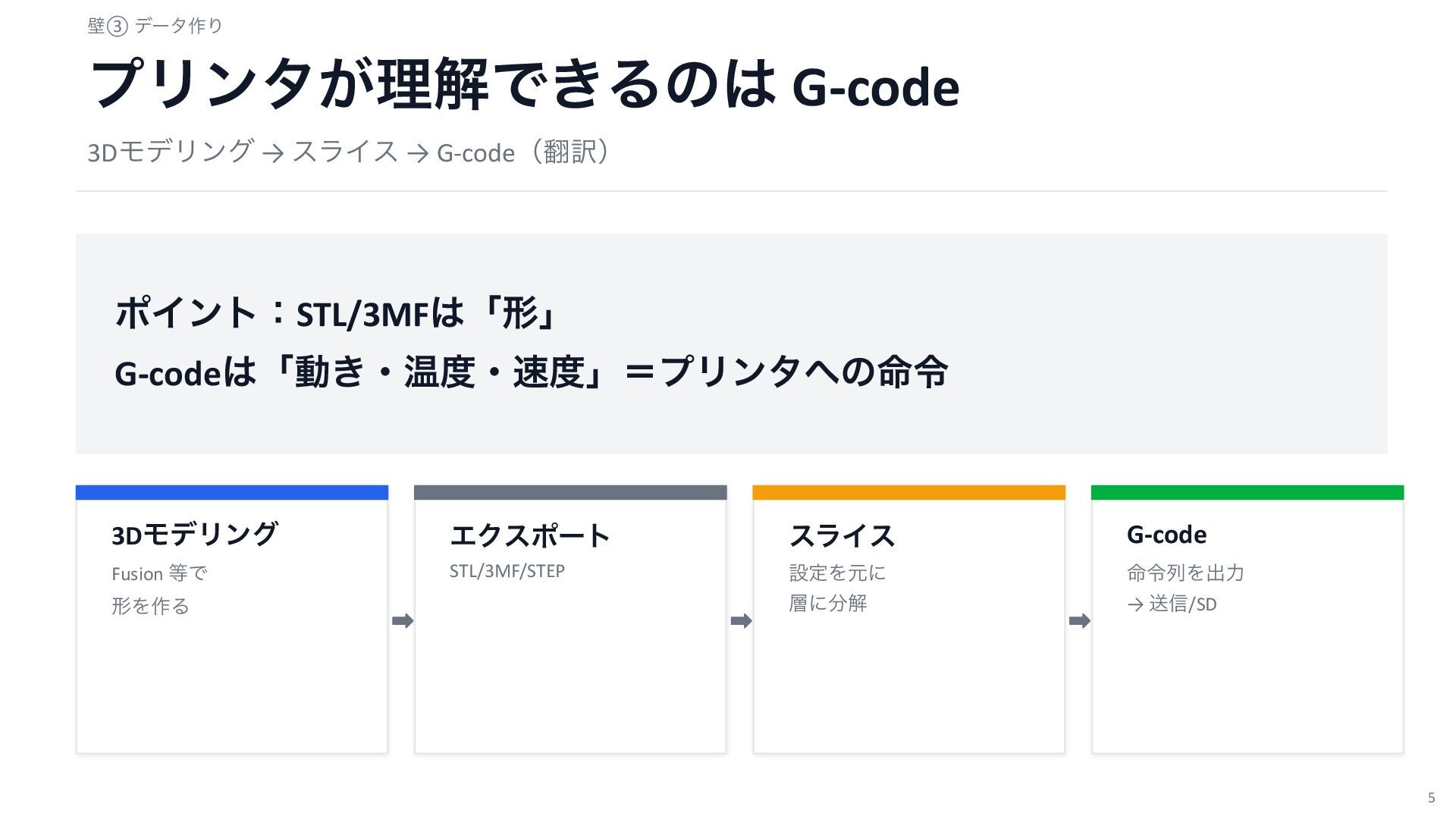 น③ σʔλ࡞Γ ϓϦϯλ͕ཧղͰ͖Δͷ G-code 3DϞσϦϯά → εϥΠε → G-codeʢ༁ʣ ϙΠϯτɿSTL/3MFʮܗʯ