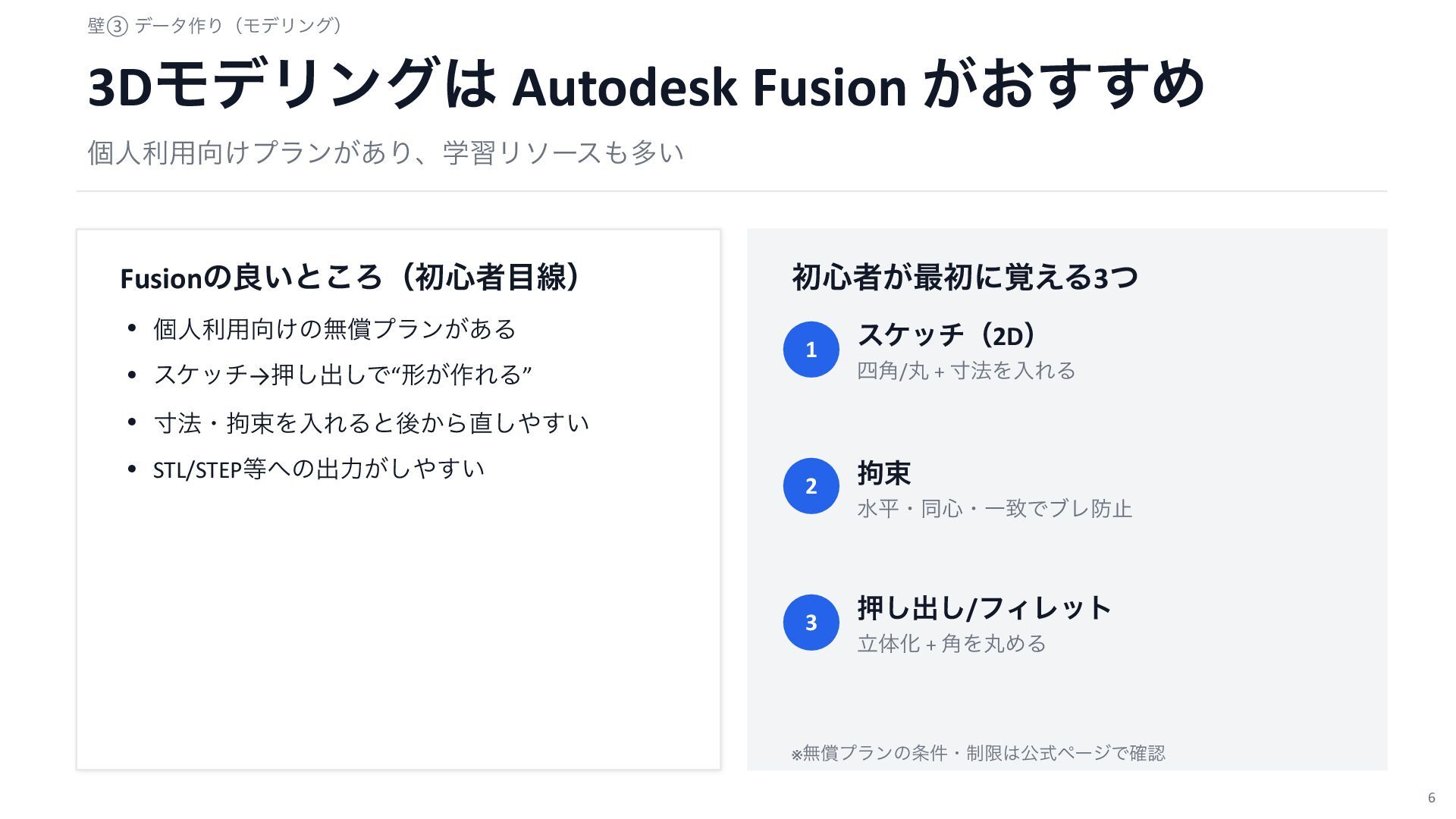 น③ σʔλ࡞ΓʢϞσϦϯάʣ 3DϞσϦϯά Autodesk Fusion ͕͓͢͢Ί ݸਓར༻͚ϓϥϯ͕͋ΓɺֶशϦιʔεଟ͍ Fusionͷྑ͍ͱ͜Ζʢॳ৺ऀઢʣ • ݸਓར༻͚ͷແঈϓϥϯ͕͋Δ