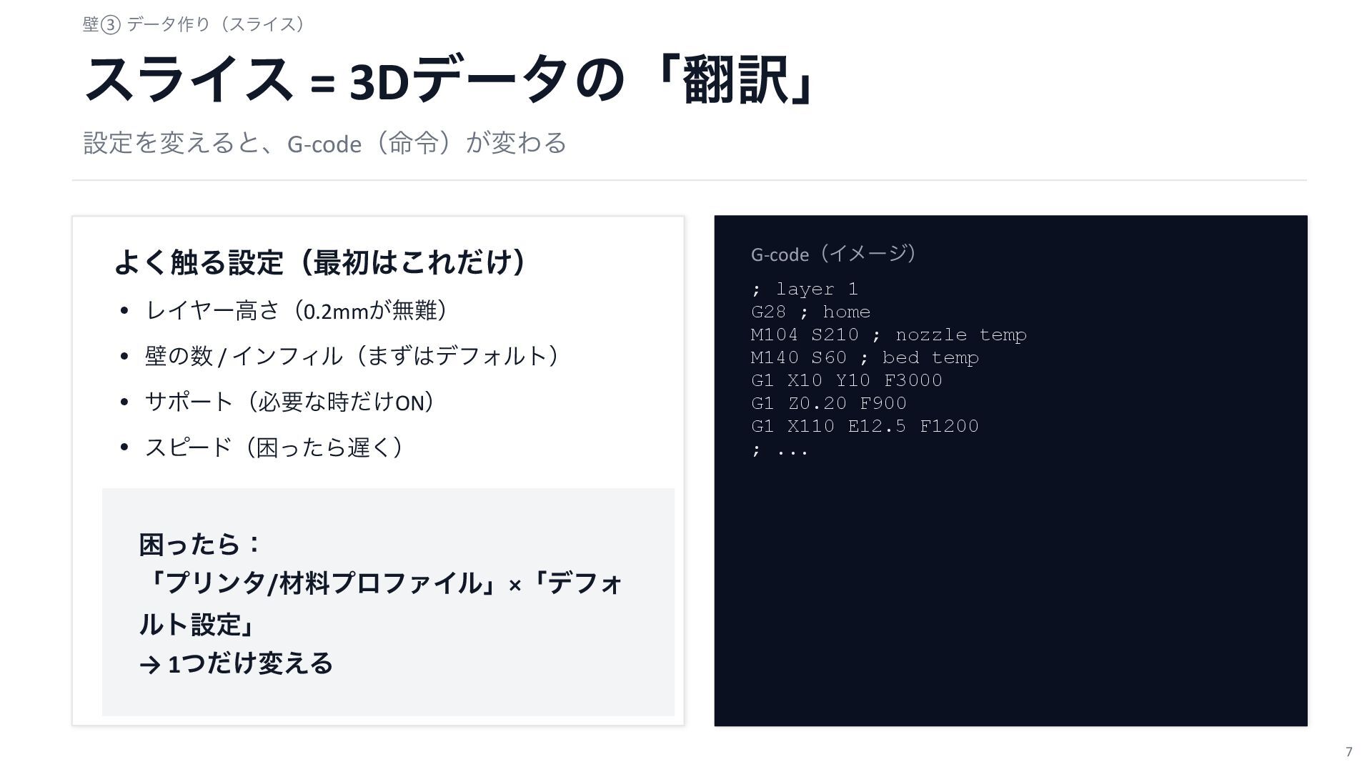 • εέον→ԡ͠ग़͠Ͱ“ܗ͕࡞ΕΔ” • ੇ๏ɾ߆ଋΛೖΕΔͱޙ͔Β͍͢͠ • STL/STEPͷग़ྗ͕͍͢͠ ॳ৺ऀ͕࠷ॳʹ֮͑Δ3ͭ 1 εέονʢ2Dʣ ࢛֯/ؙ + ੇ๏ΛೖΕΔ 2 ߆ଋ ਫฏɾಉ৺ɾҰகͰϒϨࢭ 3 ԡ͠ग़͠/ϑΟϨοτ ཱମԽ + ֯ΛؙΊΔ ※ແঈϓϥϯͷ݅ɾ੍ݶެࣜϖʔδͰ֬ೝ 6