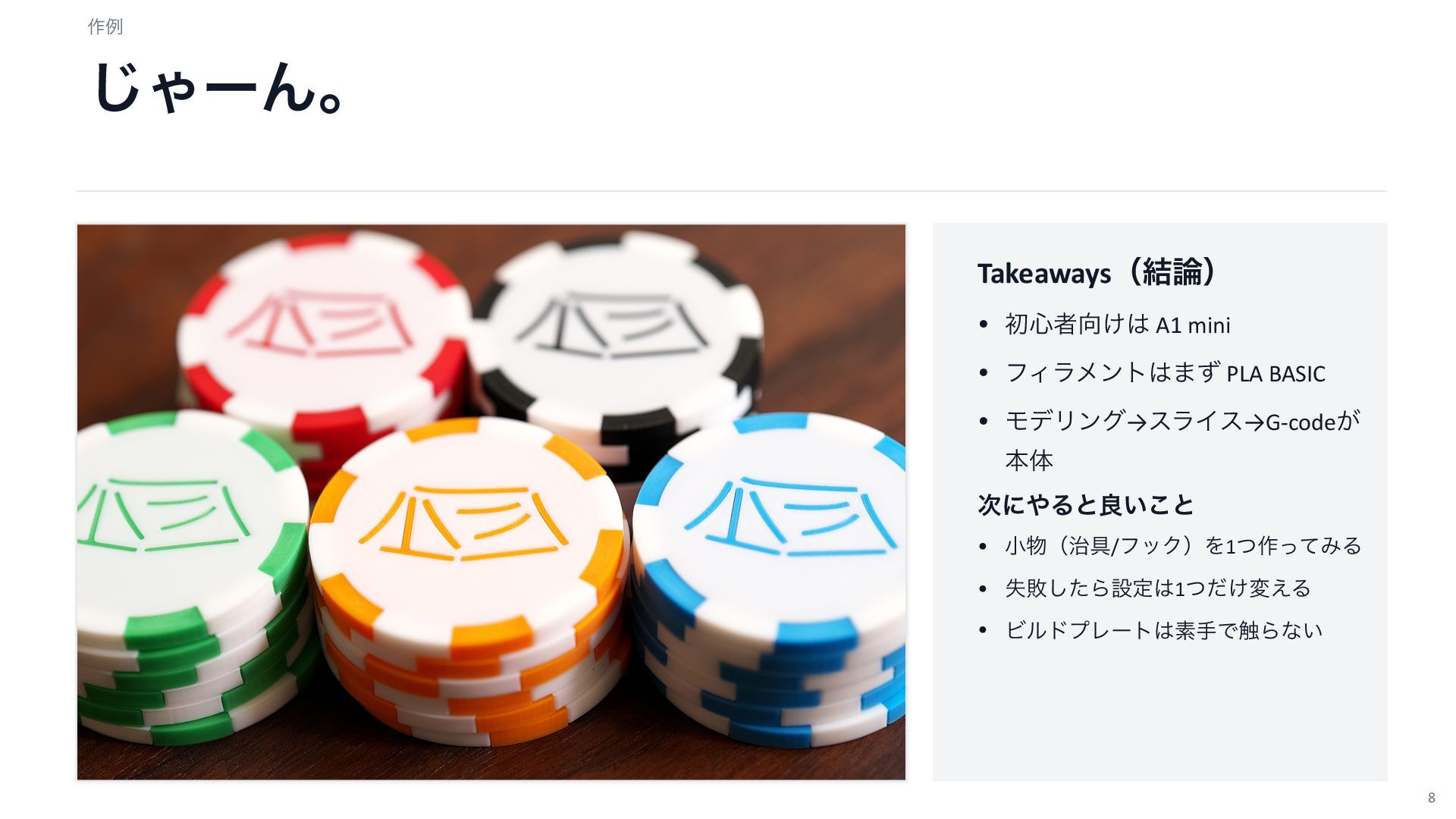 ࡞ྫ ͡ΌʔΜɻ Takeawaysʢ݁ʣ • ॳ৺ऀ͚ A1 mini • ϑΟϥϝϯτ·ͣ PLA
