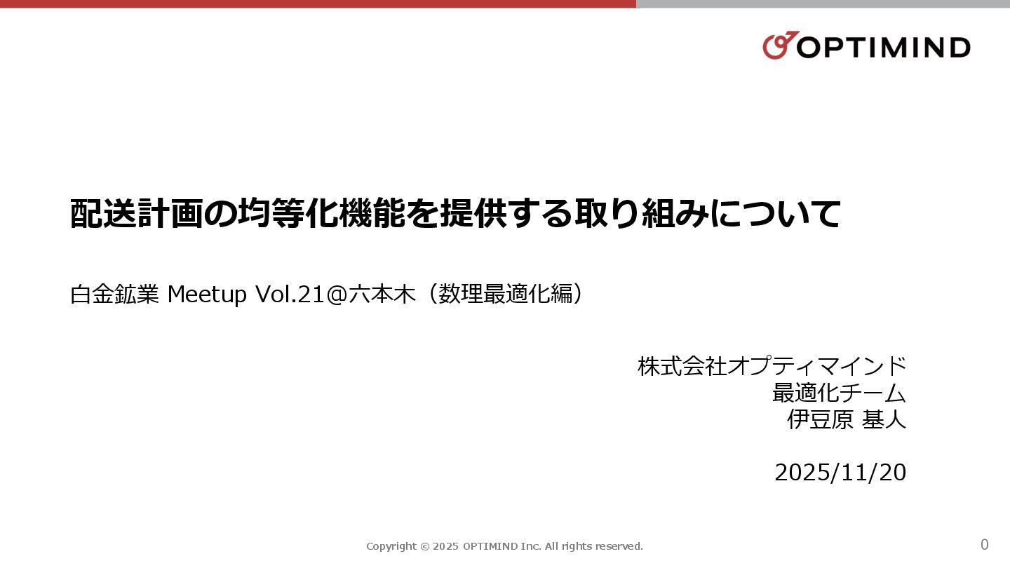 ⽩⾦鉱業 Meetup Vol.21@六本⽊(数理最適化編) 株式会社オプティマインド 最適化チーム 伊⾖原 基⼈ 2025/11/20