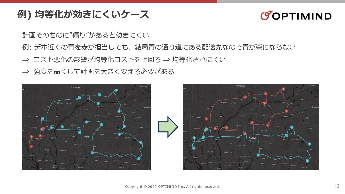 均等化が効きにくいケース 計画そのものに”偏り”があると効きにくい 例: デポ近くの⻘を⾚が担当しても、結局⻘の通り道にある配送先なので⻘が楽にならない ⇒ コスト悪化の影響が均等化コストを上回る ⇒ 均等化されにくい ⇒ 強度を⾼くして計画を⼤きく変える必要がある