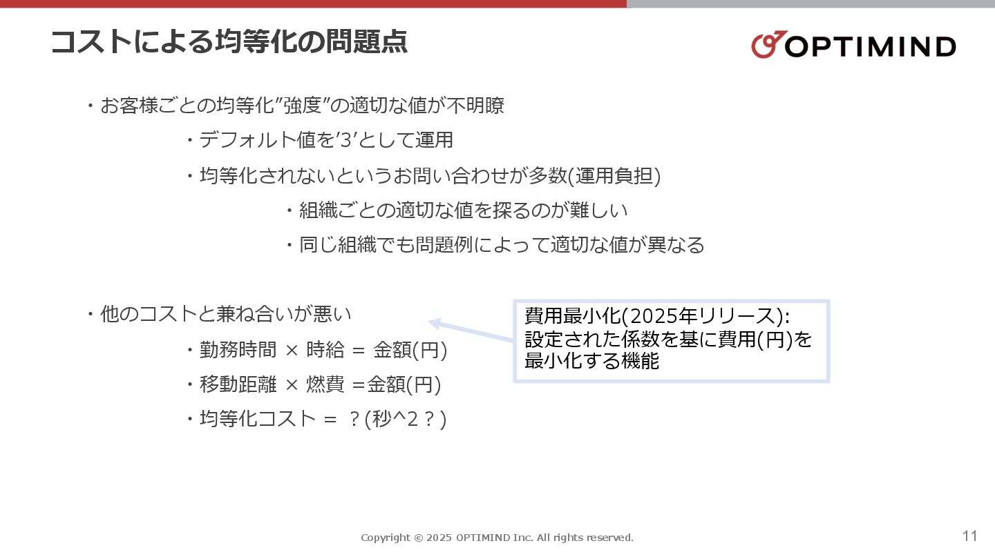 Copyright © 2025 OPTIMIND Inc. All rights reserved. 11 コストによる均等化の問題点