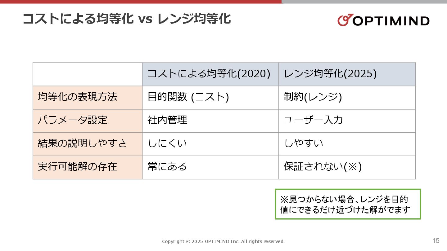 vs レンジ均等化 コストによる均等化(2020) レンジ均等化(2025) 均等化の表現⽅法 ⽬的関数 (コスト) 制約(レンジ) パラメータ設定 社内管理 ユーザー⼊⼒ 結果の説明しやすさ しにくい しやすい 実⾏可能解の存在 常にある 保証されない(※) ※見つからない場合、レンジを目的 値にできるだけ近づけた解がでます