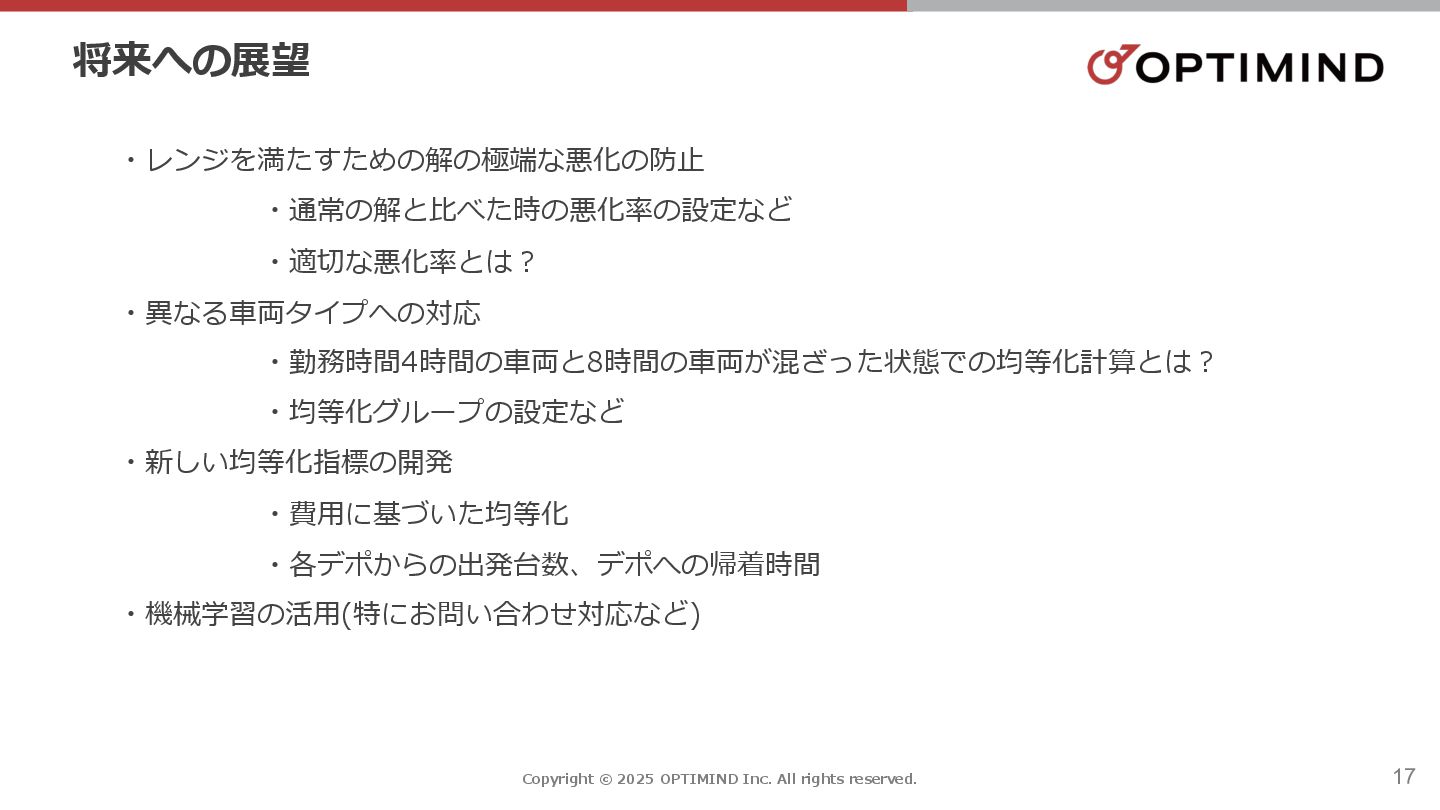 ・レンジを満たすための解の極端な悪化の防⽌ ・通常の解と⽐べた時の悪化率の設定など ・適切な悪化率とは︖ ・異なる⾞両タイプへの対応 ・勤務時間4時間の⾞両と8時間の⾞両が混ざった状態での均等化計算とは︖ ・均等化グループの設定など ・新しい均等化指標の開発 ・費⽤に基づいた均等化 ・各デポからの出発台数、デポへの帰着時間 ・機械学習の活⽤(特にお問い合わせ対応など)