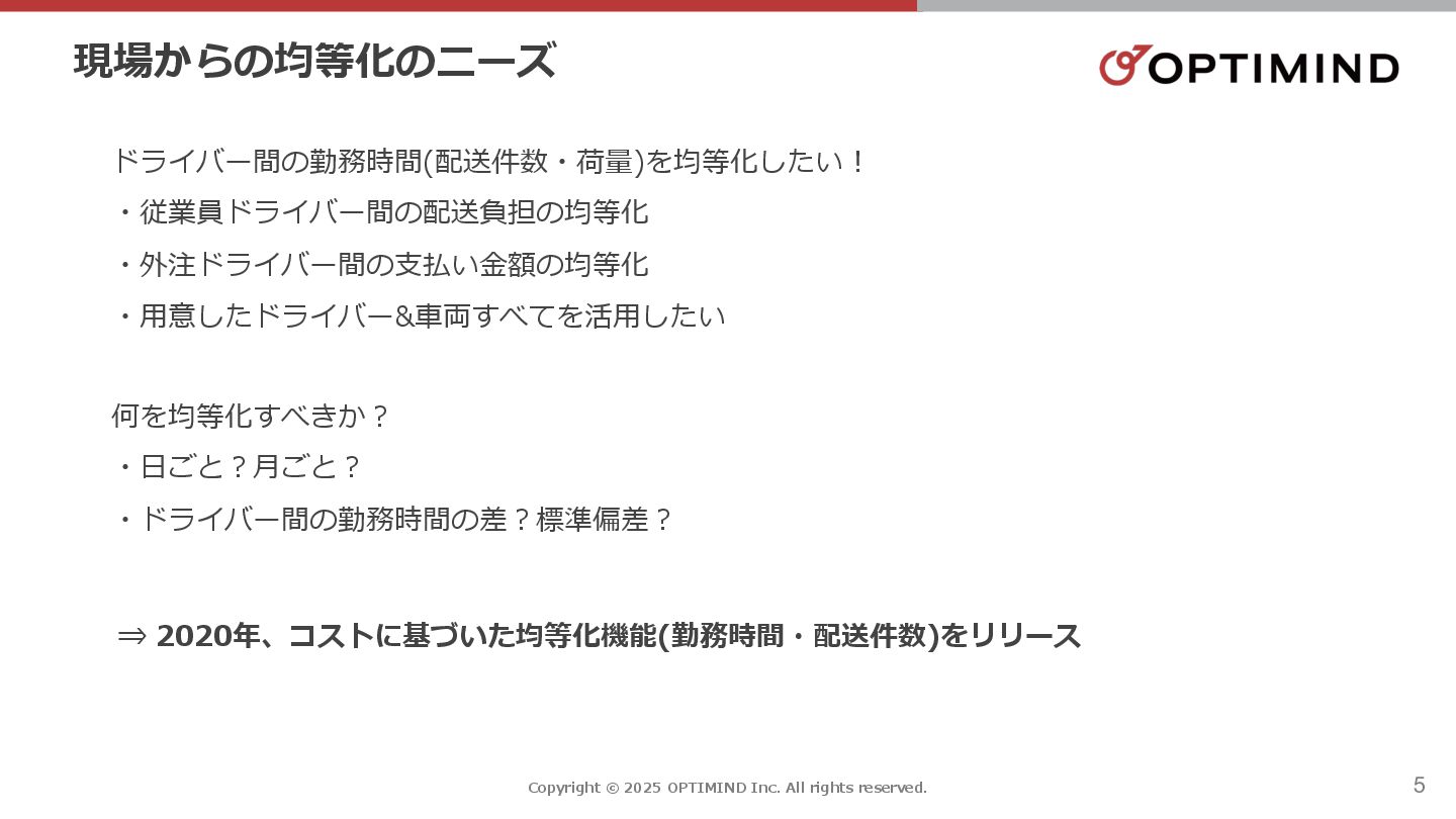 Copyright © 2025 OPTIMIND Inc. All rights reserved. 0 配送計画の均等化機能を提供する取り組みについて