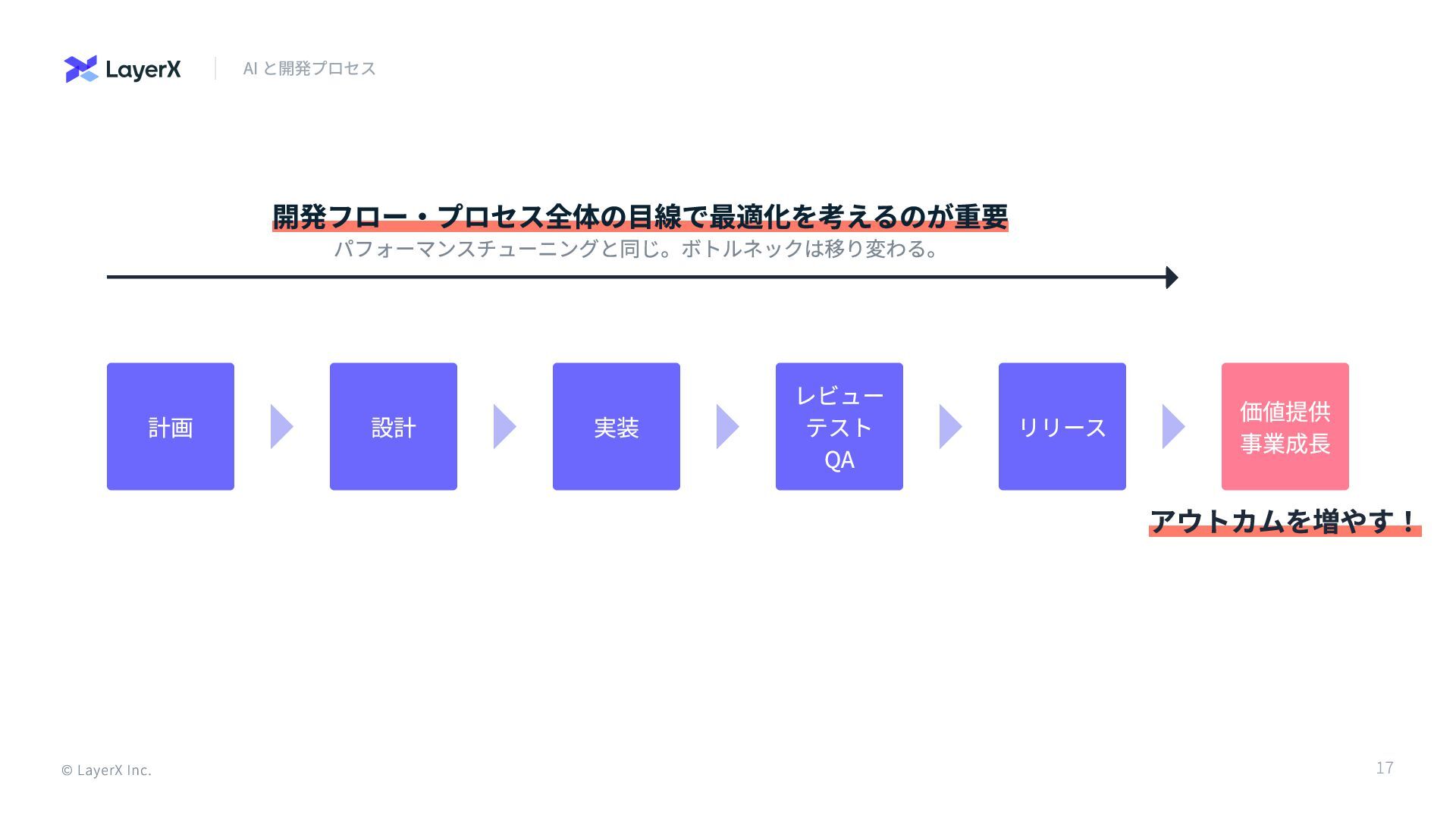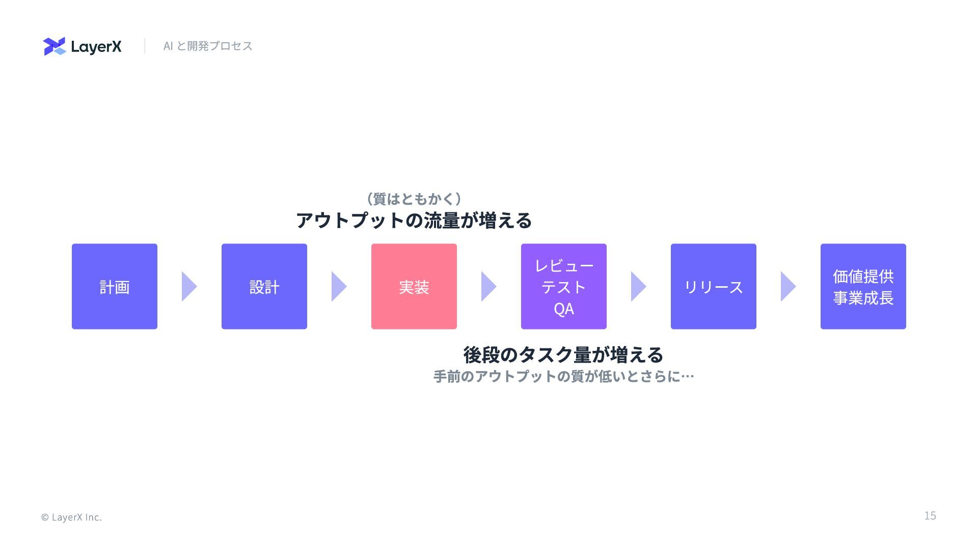 © LayerX Inc. AI と開発プロセス 計画 設計 実装 (質はともかく) アウトプットの流量が増える