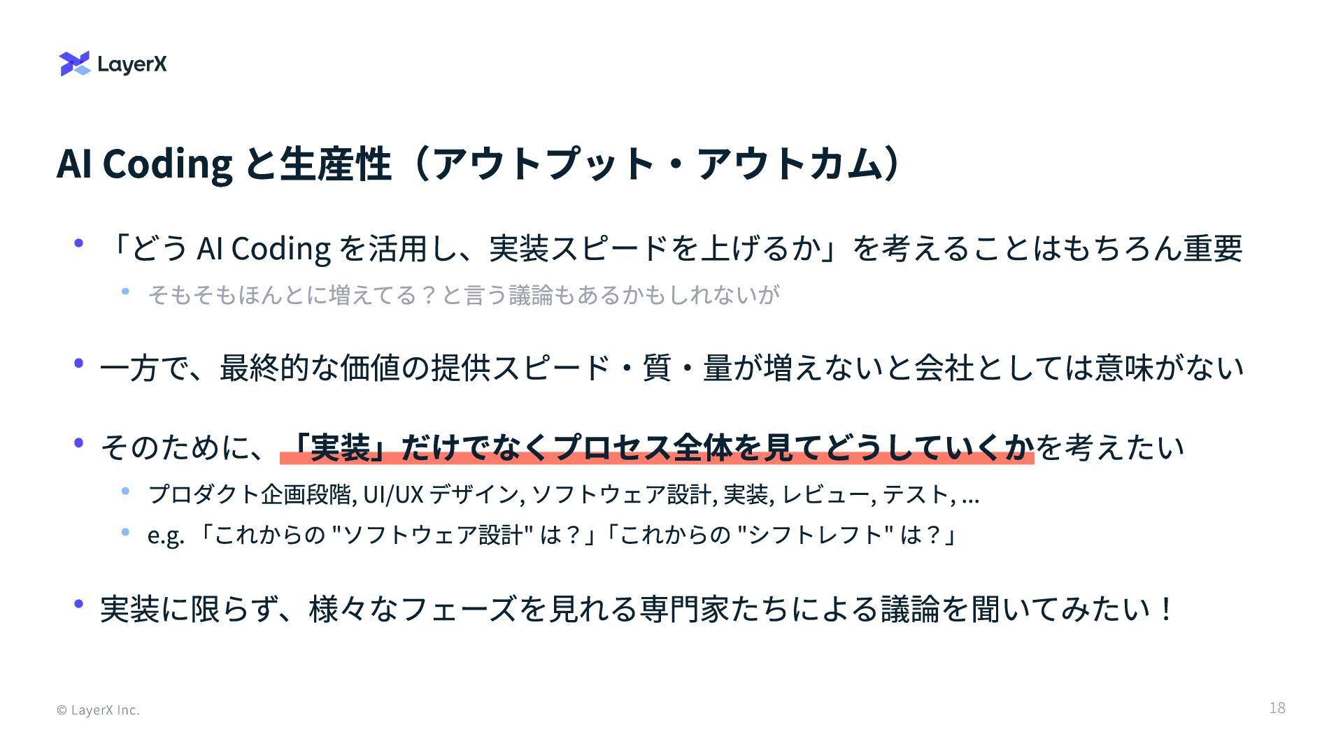AI Coding と生産性(アウトプット・アウトカム) © LayerX Inc. 「どう AI Coding を活用し、実装スピードを上げるか」を考えることはもちろん重要