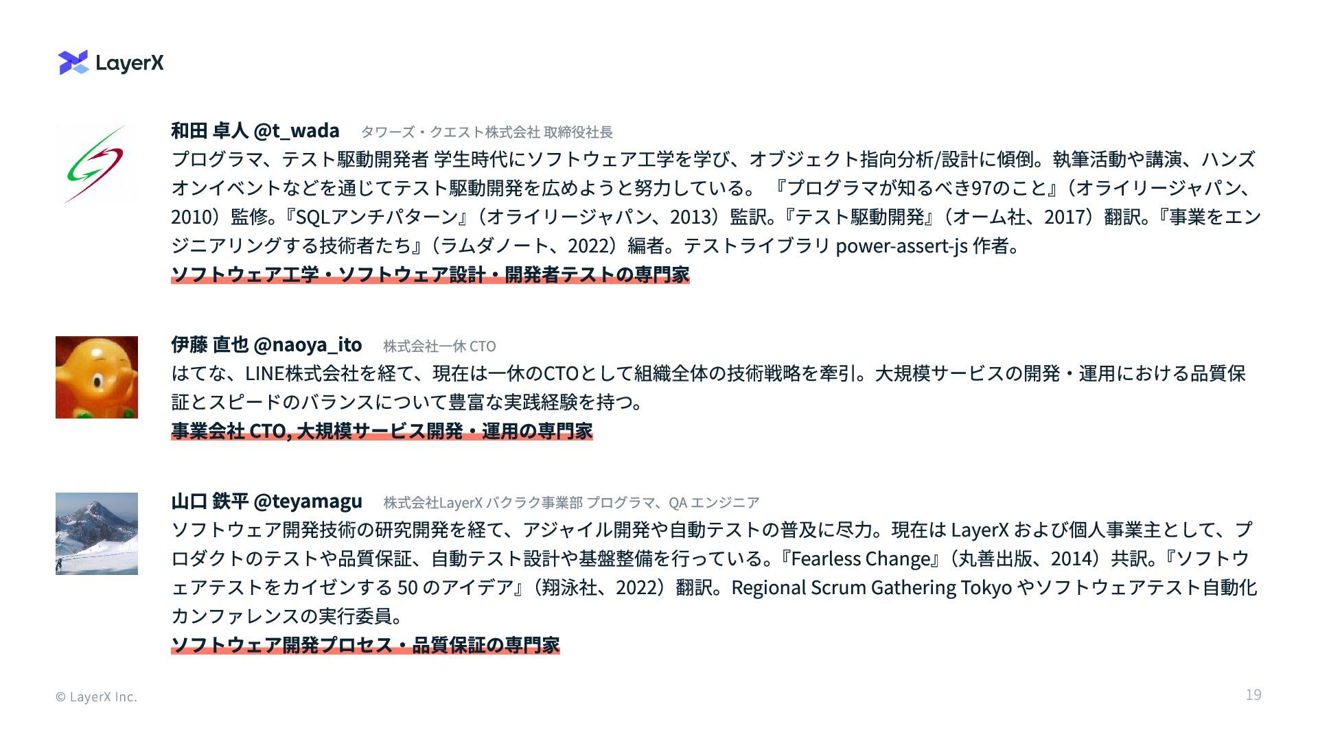 2010)監修。 『SQLアンチパターン』 (オライリージャパン、2013)監訳。 『テスト駆動開発』 (オーム社、2017)翻訳。 『事業をエン ジニアリングする技術者たち』 (ラムダノート、2022)編者。テストライブラリ power-assert-js 作者。 ソフトウェア工学・ソフトウェア設計・開発者テストの専門家 伊藤 直也 @naoya_ito 株式会社一休 CTO はてな、LINE株式会社を経て、現在は一休のCTOとして組織全体の技術戦略を牽引。大規模サービスの開発・運用における品質保 証とスピードのバランスについて豊富な実践経験を持つ。 事業会社 CTO, 大規模サービス開発・運用の専門家 山口 鉄平 @teyamagu 株式会社LayerX バクラク事業部 プログラマ、QA エンジニア ソフトウェア開発技術の研究開発を経て、アジャイル開発や自動テストの普及に尽力。現在は LayerX および個人事業主として、プ ロダクトのテストや品質保証、自動テスト設計や基盤整備を行っている。 『Fearless Change』 (丸善出版、2014)共訳。 『ソフトウ ェアテストをカイゼンする 50 のアイデア』 (翔泳社、2022)翻訳。Regional Scrum Gathering Tokyo やソフトウェアテスト自動化 カンファレンスの実行委員。 ソフトウェア開発プロセス・品質保証の専門家 © LayerX Inc. 19