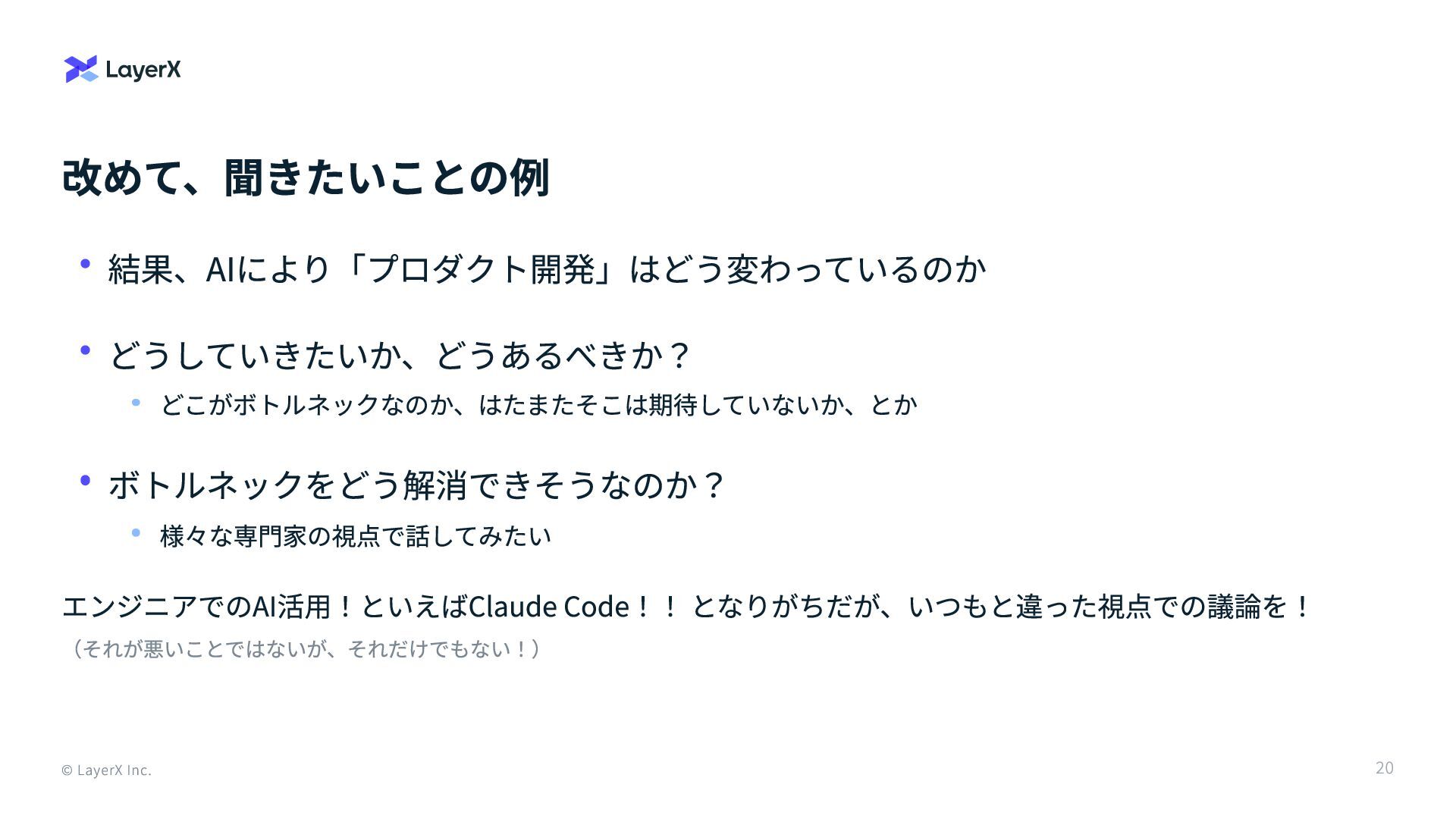 改めて、聞きたいことの例 エンジニアでのAI活用!といえばClaude Code!! となりがちだが、いつもと違った視点での議論を! (それが悪いことではないが、それだけでもない!) © LayerX Inc. 結果、AIにより「プロダクト開発」はどう変わっているのか どうしていきたいか、どうあるべきか?