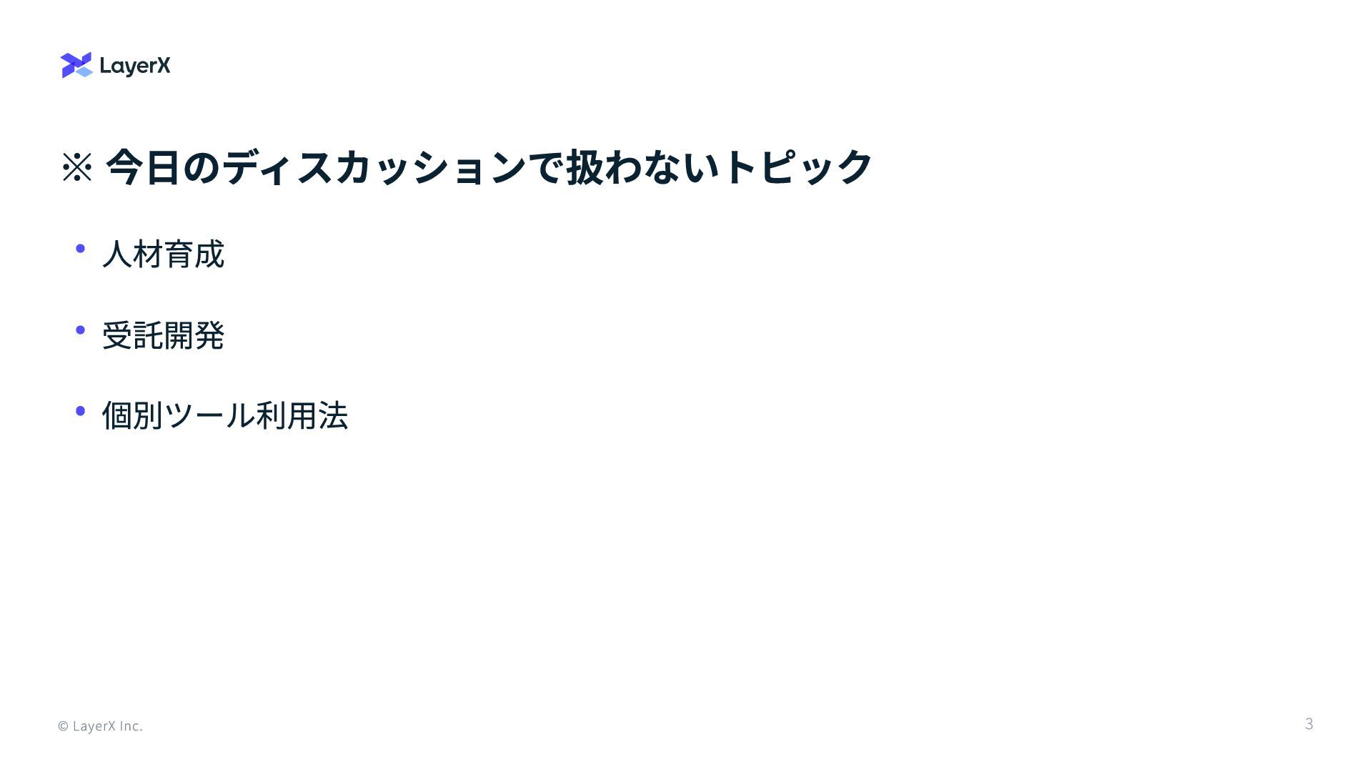 ※ 今日のディスカッションで扱わないトピック © LayerX Inc. 人材育成 受託開発 個別ツール利用法 3