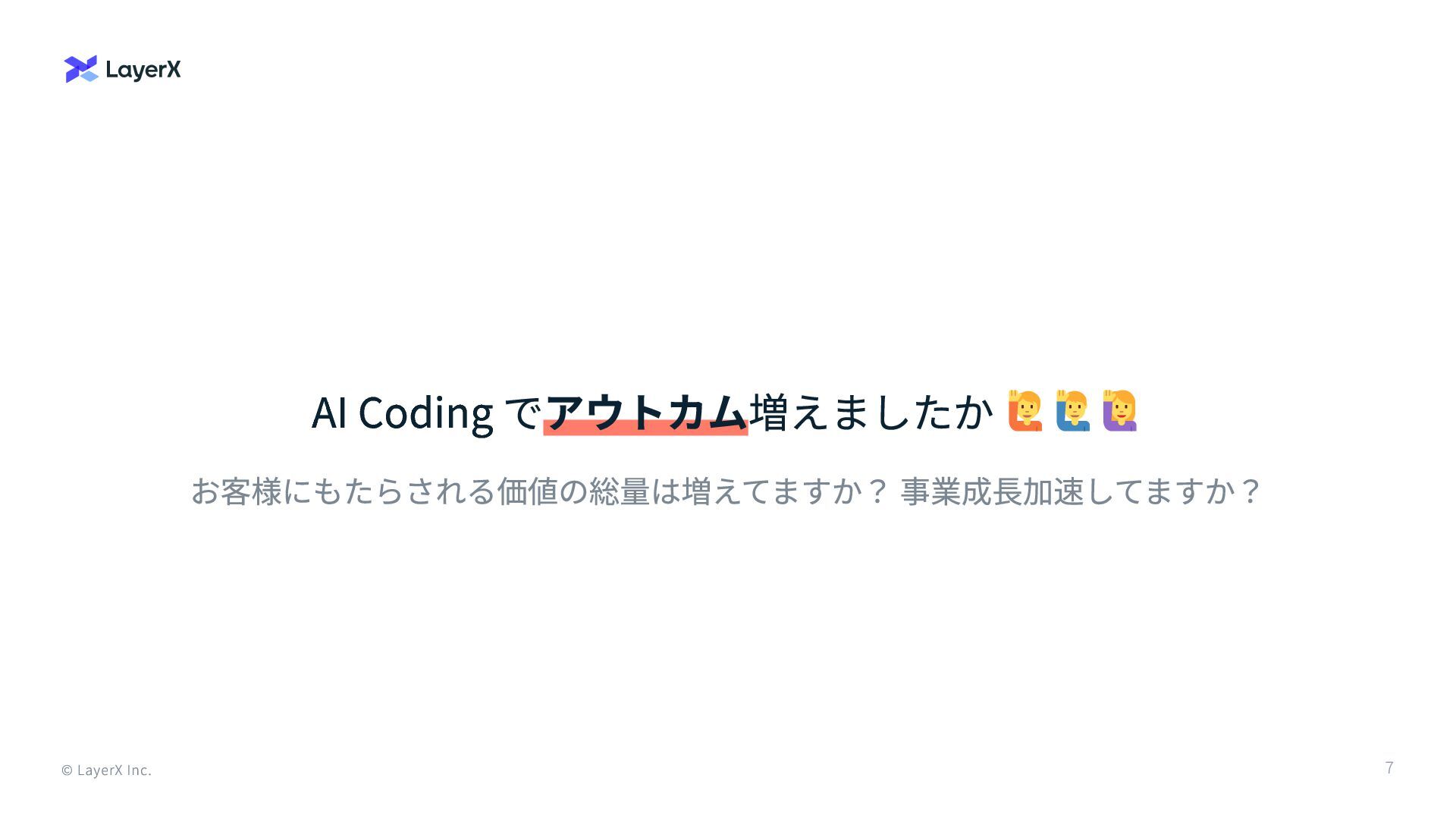 AI Coding でアウトカム増えましたか お客様にもたらされる価値の総量は増えてますか? 事業成長加速してますか? © LayerX Inc. 7