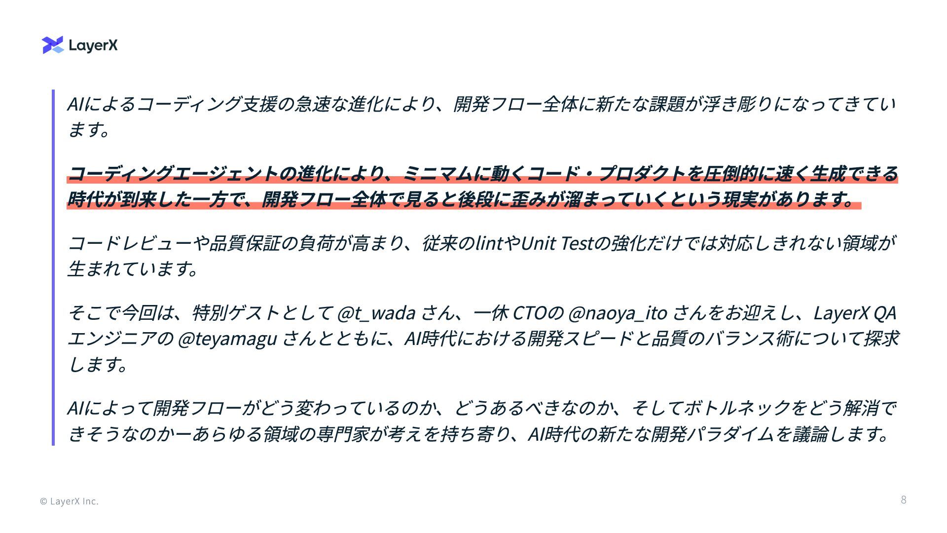 CTOの @naoya_ito さんをお迎えし、LayerX QA エンジニアの @teyamagu さんとともに、AI時代における開発スピードと品質のバランス術について探求 します。 AIによって開発フローがどう変わっているのか、どうあるべきなのか、そしてボトルネックをどう解消で きそうなのかーあらゆる領域の専門家が考えを持ち寄り、AI時代の新たな開発パラダイムを議論します。 © LayerX Inc. 8
