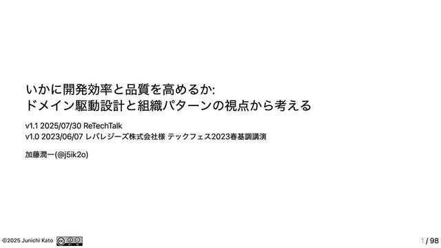 1. ©2025 Junichi Kato 1 / 98 いかに開発効率と品質を高めるか: ドメイン駆動設計と組織パターンの視点から考える v1.1 2025/07/30
