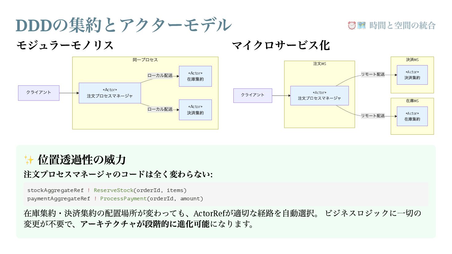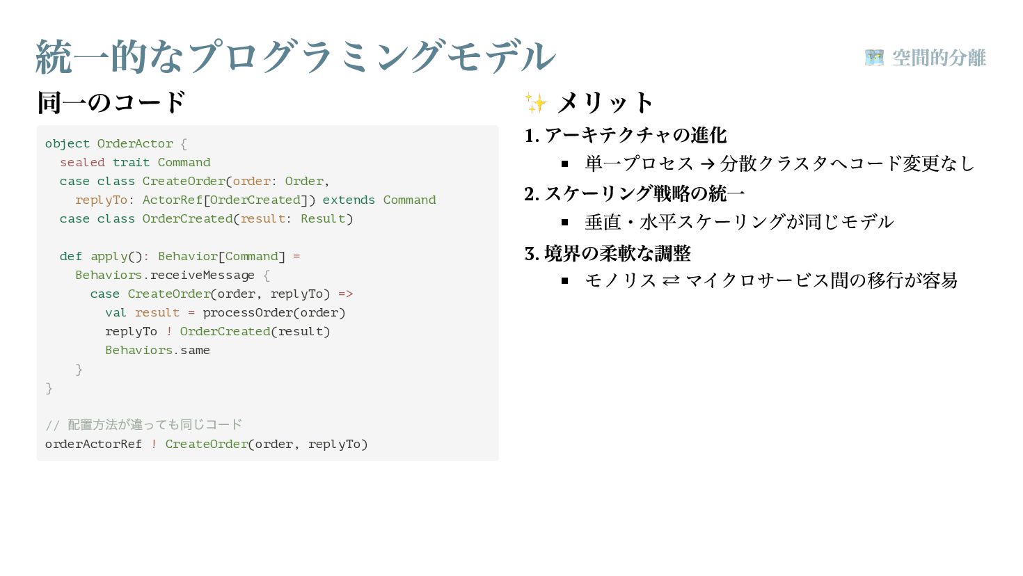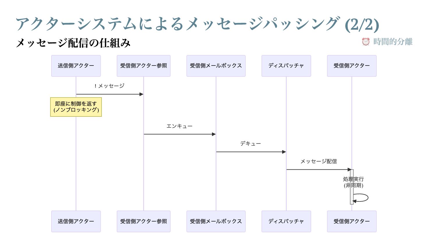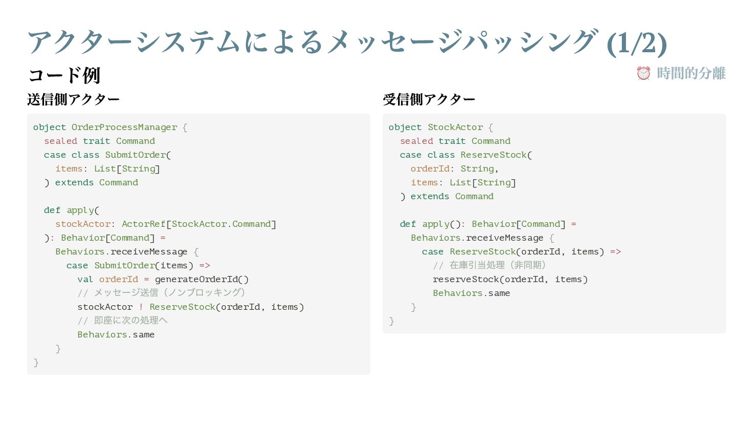 sealed trait Command case class SubmitOrder( items: List[String] ) extends Command def apply( stockActor: ActorRef[StockActor.Command] ): Behavior[Command] = Behaviors.receiveMessage { case SubmitOrder(items) => val orderId = generateOrderId() // メッセージ送信(ノンブロッキング) stockActor ! ReserveStock(orderId, items) // 即座に次の処理へ Behaviors.same } } object StockActor { sealed trait Command case class ReserveStock( orderId: String, items: List[String] ) extends Command def apply(): Behavior[Command] = Behaviors.receiveMessage { case ReserveStock(orderId, items) => // 在庫引当処理(非同期) reserveStock(orderId, items) Behaviors.same } }