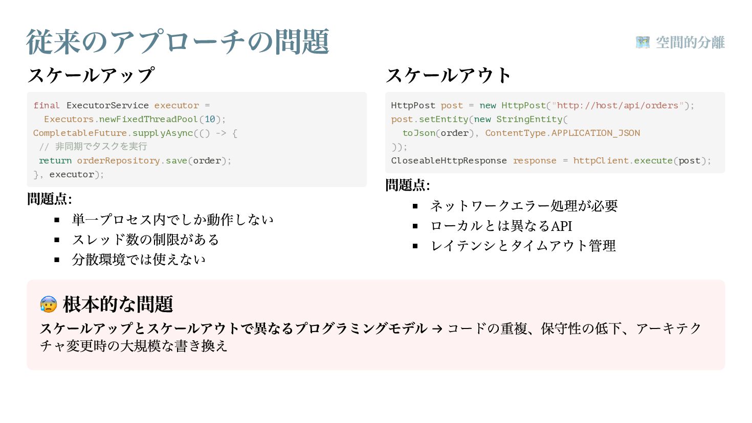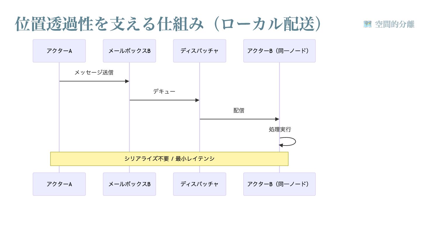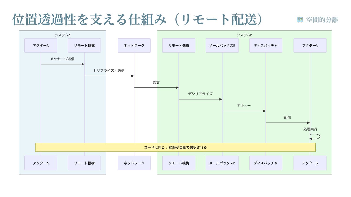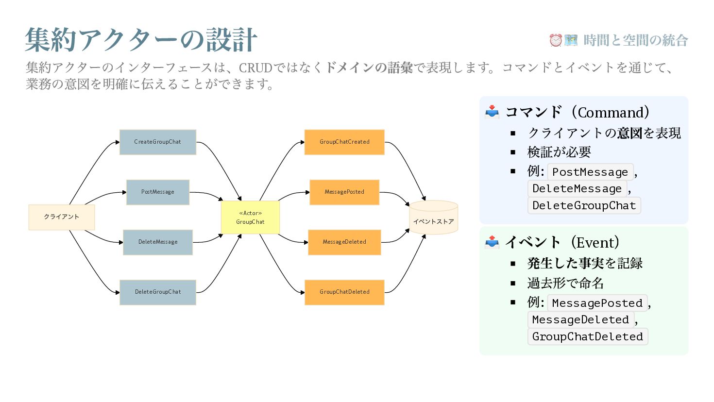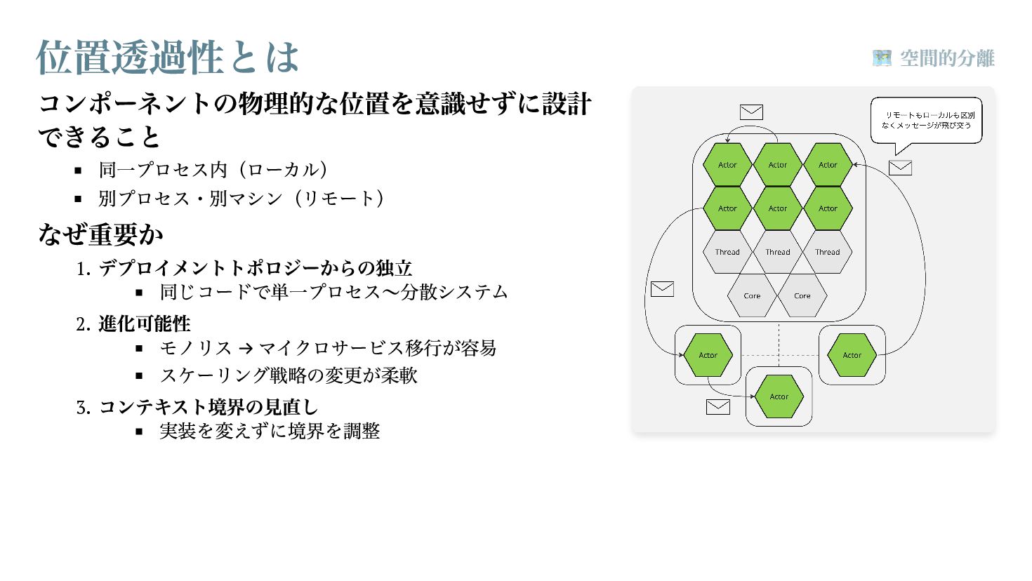 sealed trait Command case class SubmitOrder( items: List[String] ) extends Command def apply( stockActor: ActorRef[StockActor.Command] ): Behavior[Command] = Behaviors.receiveMessage { case SubmitOrder(items) => val orderId = generateOrderId() // メッセージ送信(ノンブロッキング) stockActor ! ReserveStock(orderId, items) // 即座に次の処理へ Behaviors.same } } object StockActor { sealed trait Command case class ReserveStock( orderId: String, items: List[String] ) extends Command def apply(): Behavior[Command] = Behaviors.receiveMessage { case ReserveStock(orderId, items) => // 在庫引当処理(非同期) reserveStock(orderId, items) Behaviors.same } }