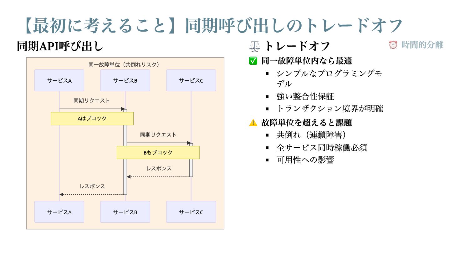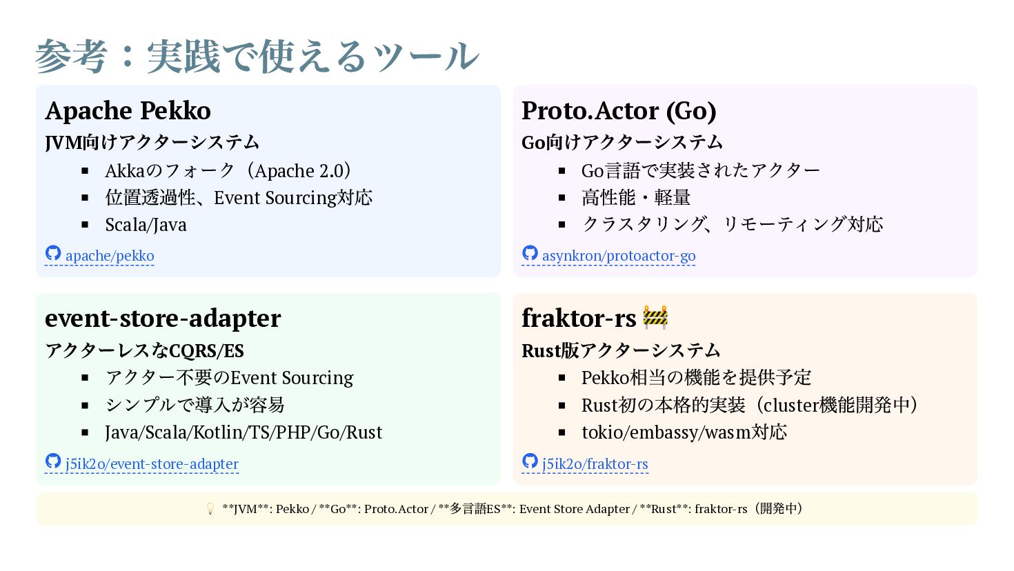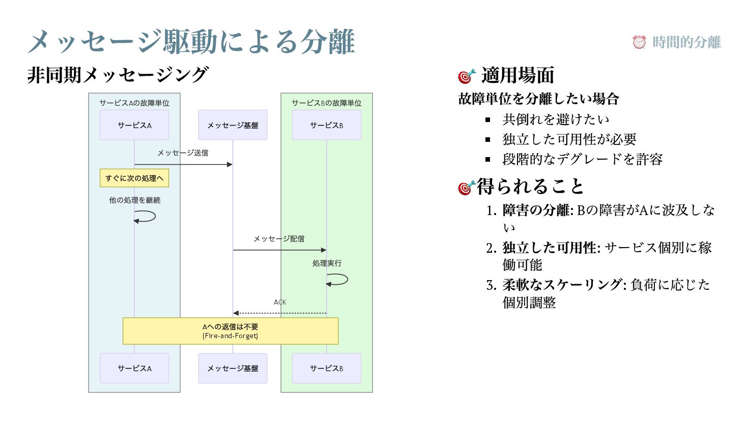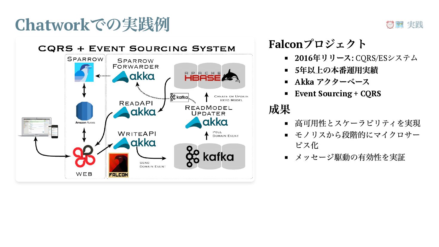 sealed trait Command case class SubmitOrder( items: List[String] ) extends Command def apply( stockActor: ActorRef[StockActor.Command] ): Behavior[Command] = Behaviors.receiveMessage { case SubmitOrder(items) => val orderId = generateOrderId() // メッセージ送信(ノンブロッキング) stockActor ! ReserveStock(orderId, items) // 即座に次の処理へ Behaviors.same } } object StockActor { sealed trait Command case class ReserveStock( orderId: String, items: List[String] ) extends Command def apply(): Behavior[Command] = Behaviors.receiveMessage { case ReserveStock(orderId, items) => // 在庫引当処理(非同期) reserveStock(orderId, items) Behaviors.same } }
