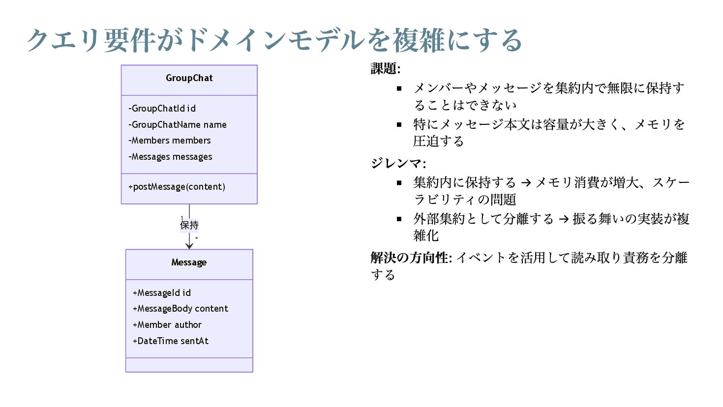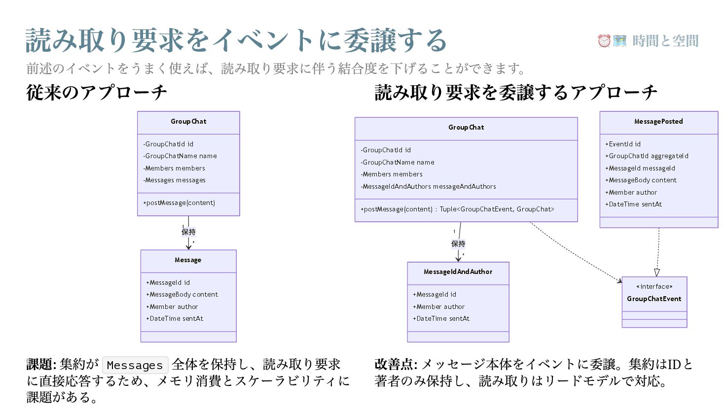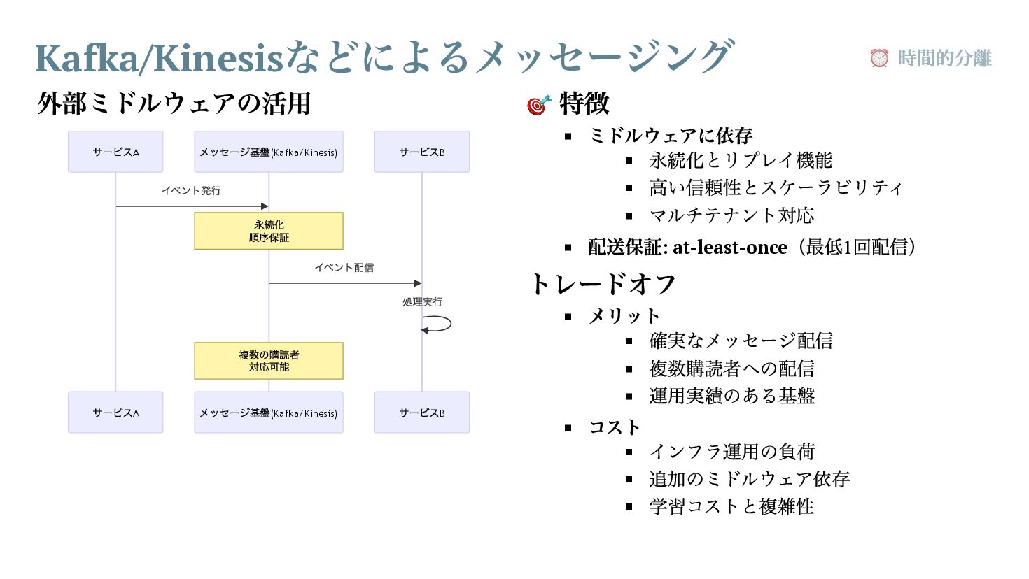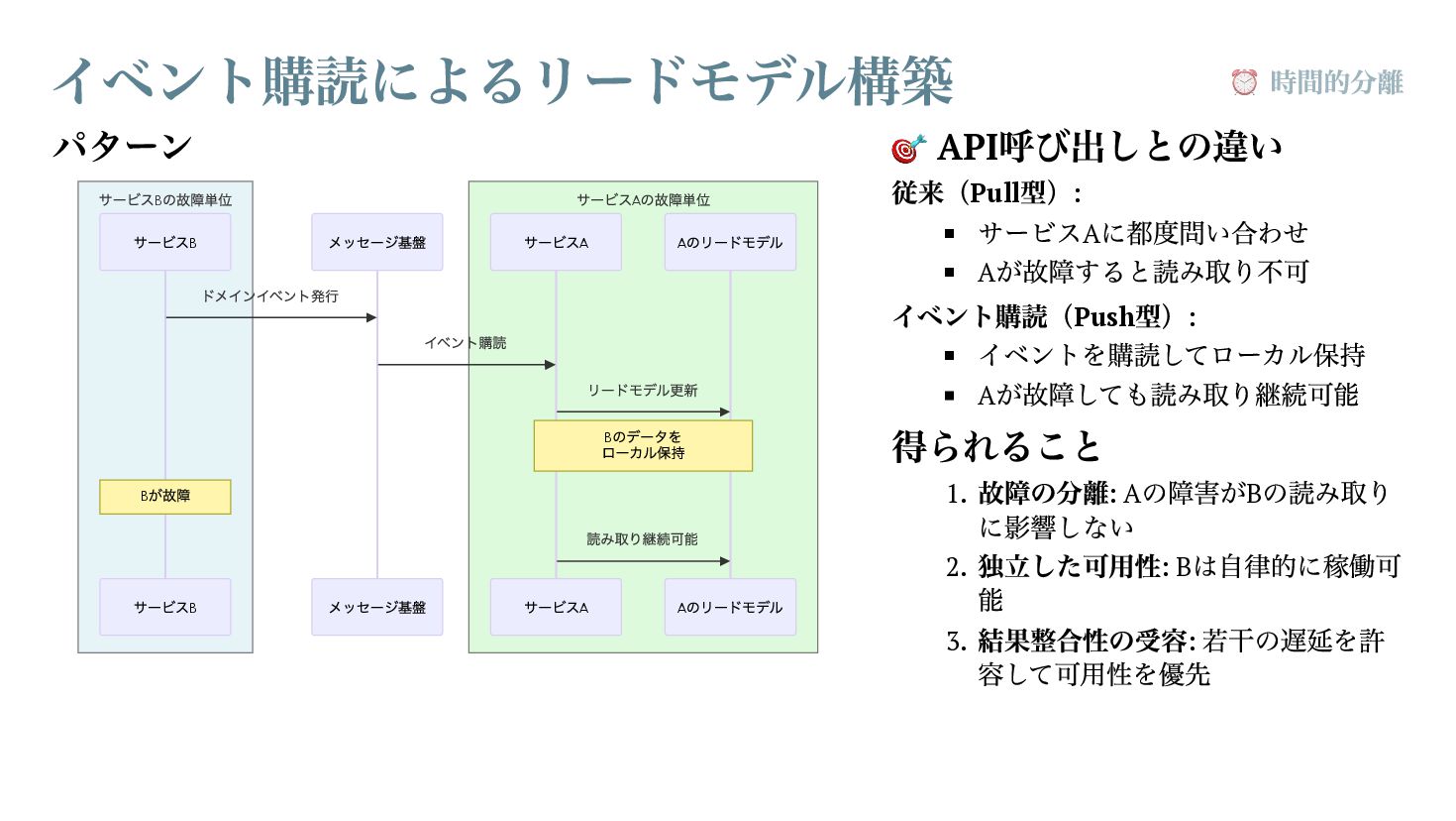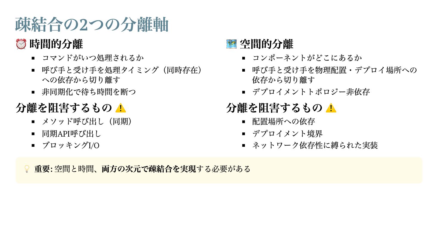 sealed trait Command case class SubmitOrder( items: List[String] ) extends Command def apply( stockActor: ActorRef[StockActor.Command] ): Behavior[Command] = Behaviors.receiveMessage { case SubmitOrder(items) => val orderId = generateOrderId() // メッセージ送信(ノンブロッキング) stockActor ! ReserveStock(orderId, items) // 即座に次の処理へ Behaviors.same } } object StockActor { sealed trait Command case class ReserveStock( orderId: String, items: List[String] ) extends Command def apply(): Behavior[Command] = Behaviors.receiveMessage { case ReserveStock(orderId, items) => // 在庫引当処理(非同期) reserveStock(orderId, items) Behaviors.same } }