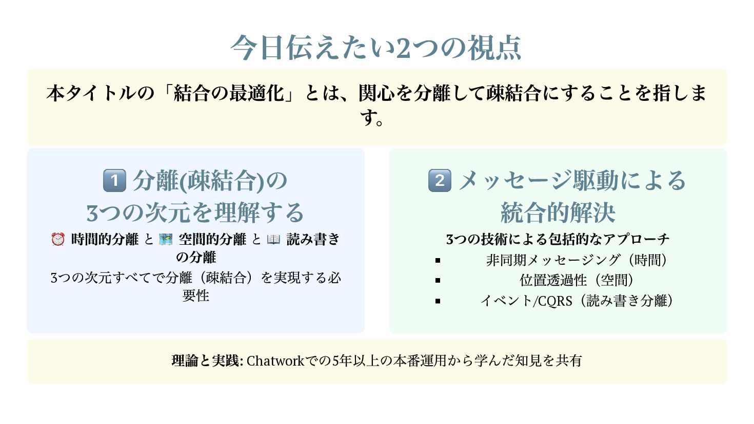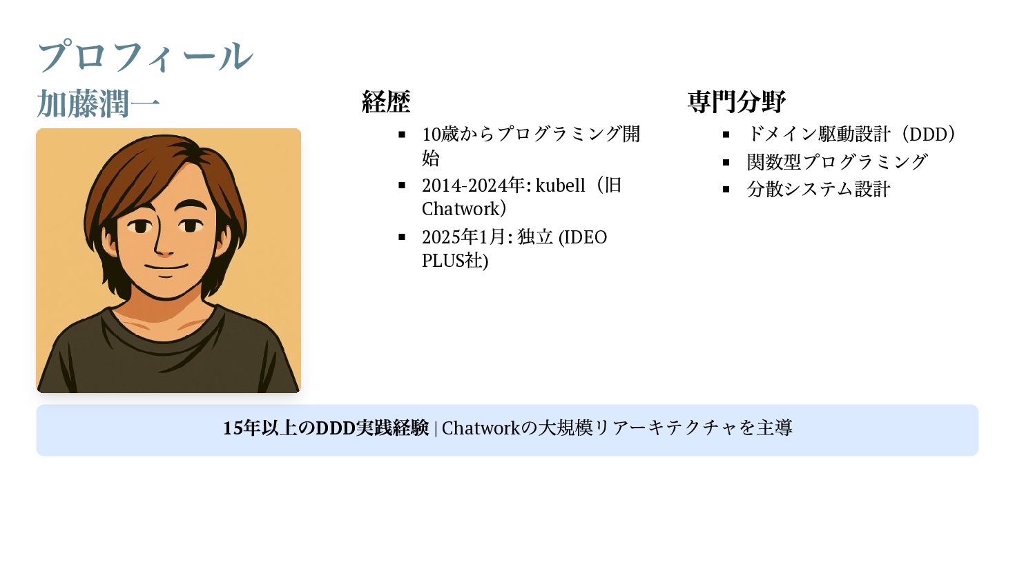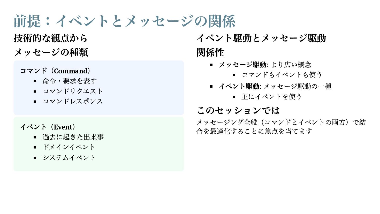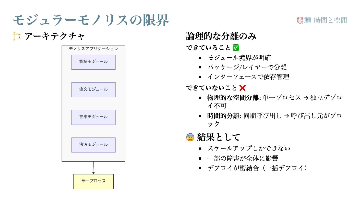 sealed trait Command case class SubmitOrder( items: List[String] ) extends Command def apply( stockActor: ActorRef[StockActor.Command] ): Behavior[Command] = Behaviors.receiveMessage { case SubmitOrder(items) => val orderId = generateOrderId() // メッセージ送信(ノンブロッキング) stockActor ! ReserveStock(orderId, items) // 即座に次の処理へ Behaviors.same } } object StockActor { sealed trait Command case class ReserveStock( orderId: String, items: List[String] ) extends Command def apply(): Behavior[Command] = Behaviors.receiveMessage { case ReserveStock(orderId, items) => // 在庫引当処理(非同期) reserveStock(orderId, items) Behaviors.same } }