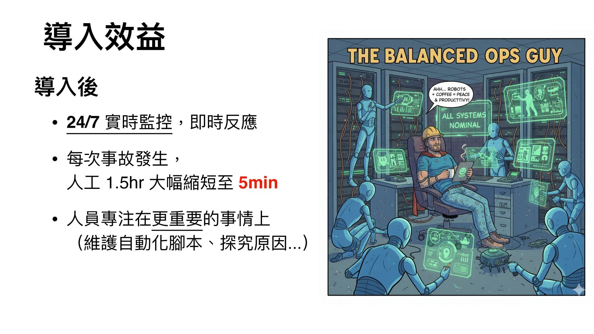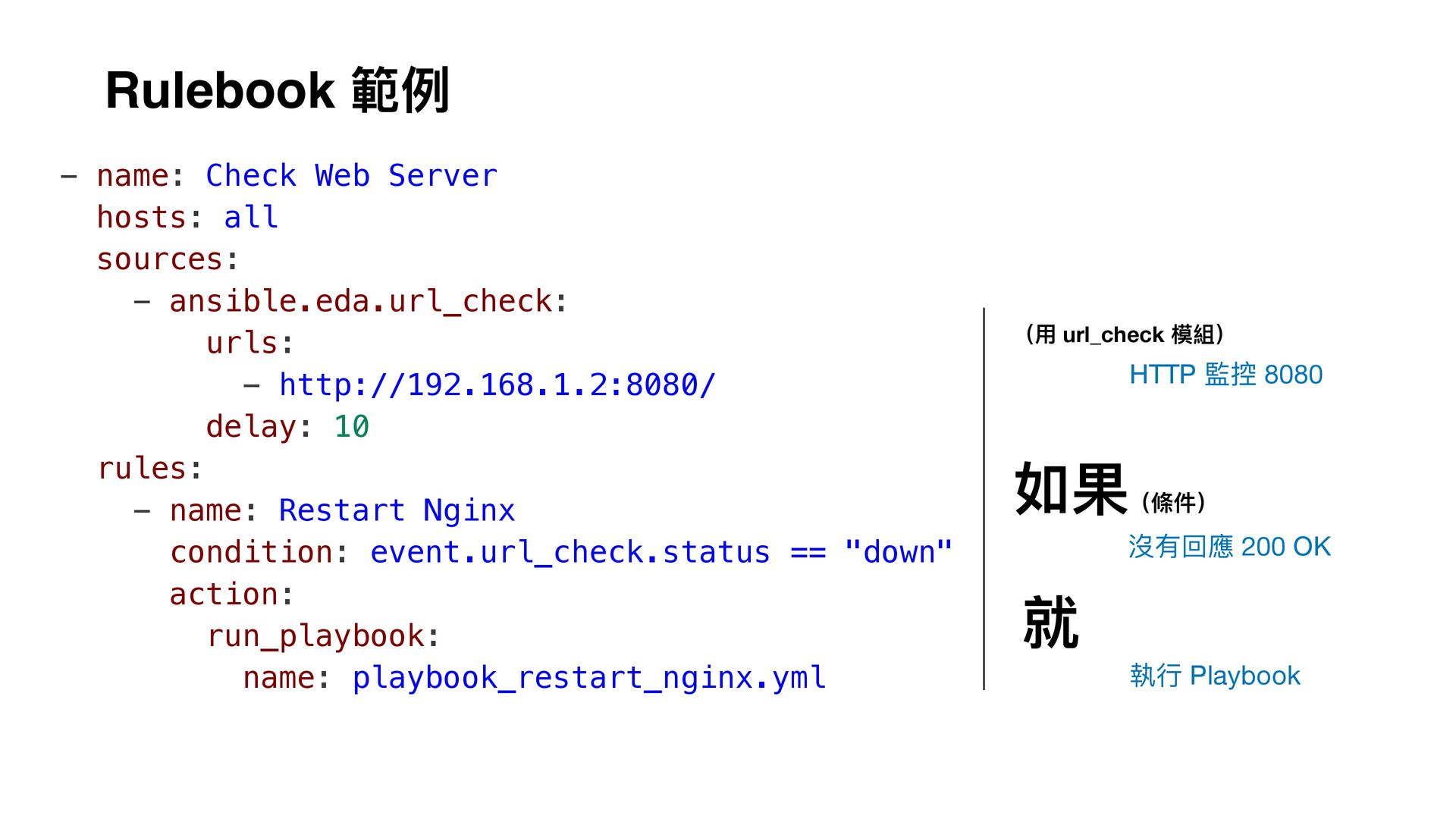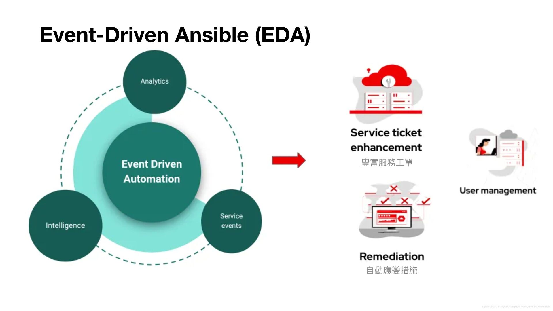 Event Driven Ansible (EDA) 的導入,能針對已知的事件,進行立即反應與迅速回復,對於未知的事件,能再第一時間搜集需要的資訊,開工單提醒管理者,並豐富工單,做為日後偵錯的依據,也是客戶邁向 AIOps 智慧維運的必經過程。