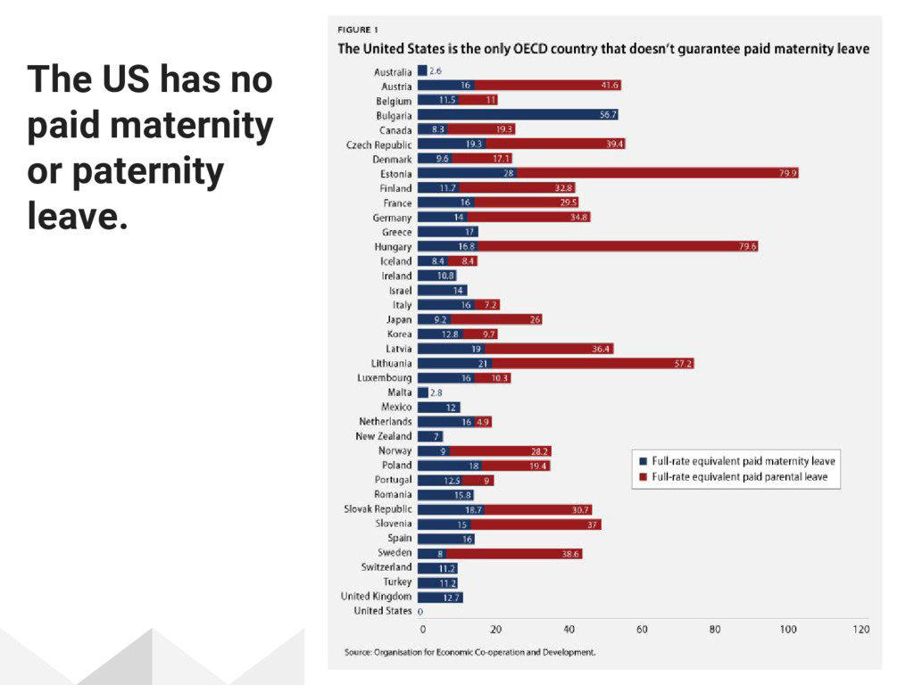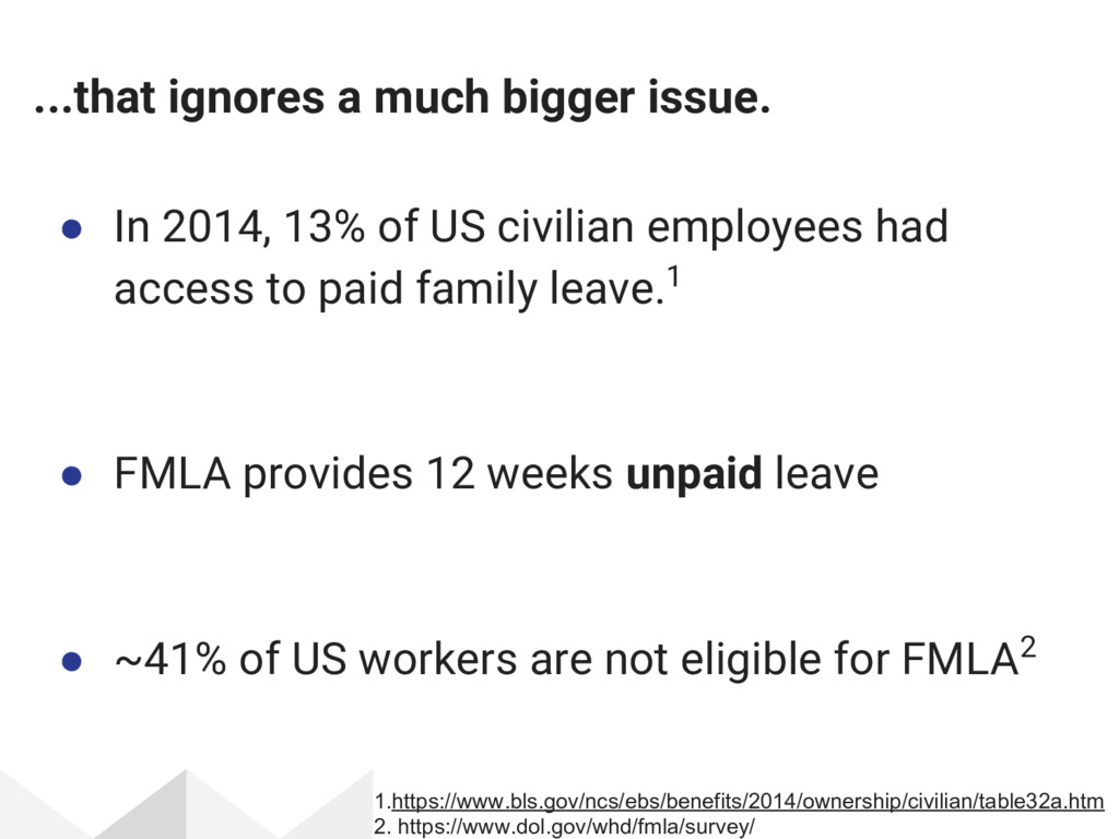 of US civilian employees had access to paid family leave.1 • FMLA provides 12 weeks unpaid leave • ~41% of US workers are not eligible for FMLA2 1.https://www.bls.gov/ncs/ebs/benefits/2014/ownership/civilian/table32a.htm 2. https://www.dol.gov/whd/fmla/survey/