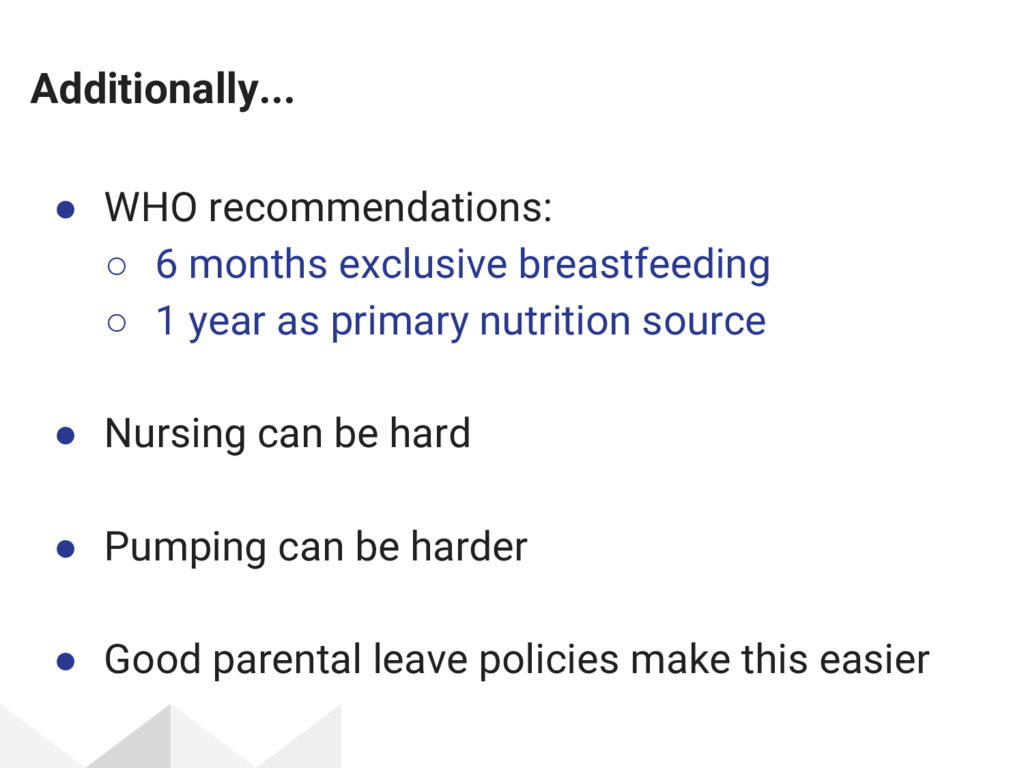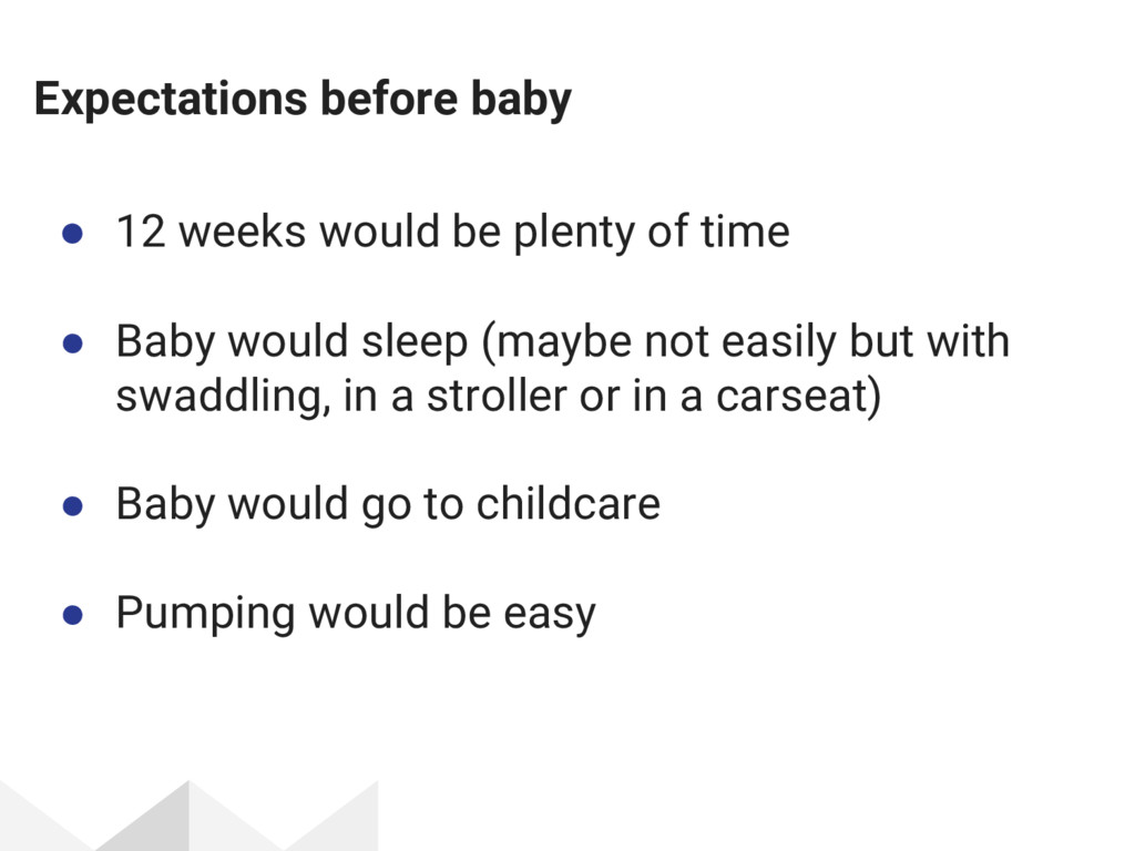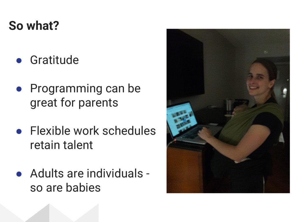I gave this talk at DjangoCon 2017. It covers my life as a programmer and new parent, and includes my personal experience as well as some tips and tricks for how I made my return to work, work for me.