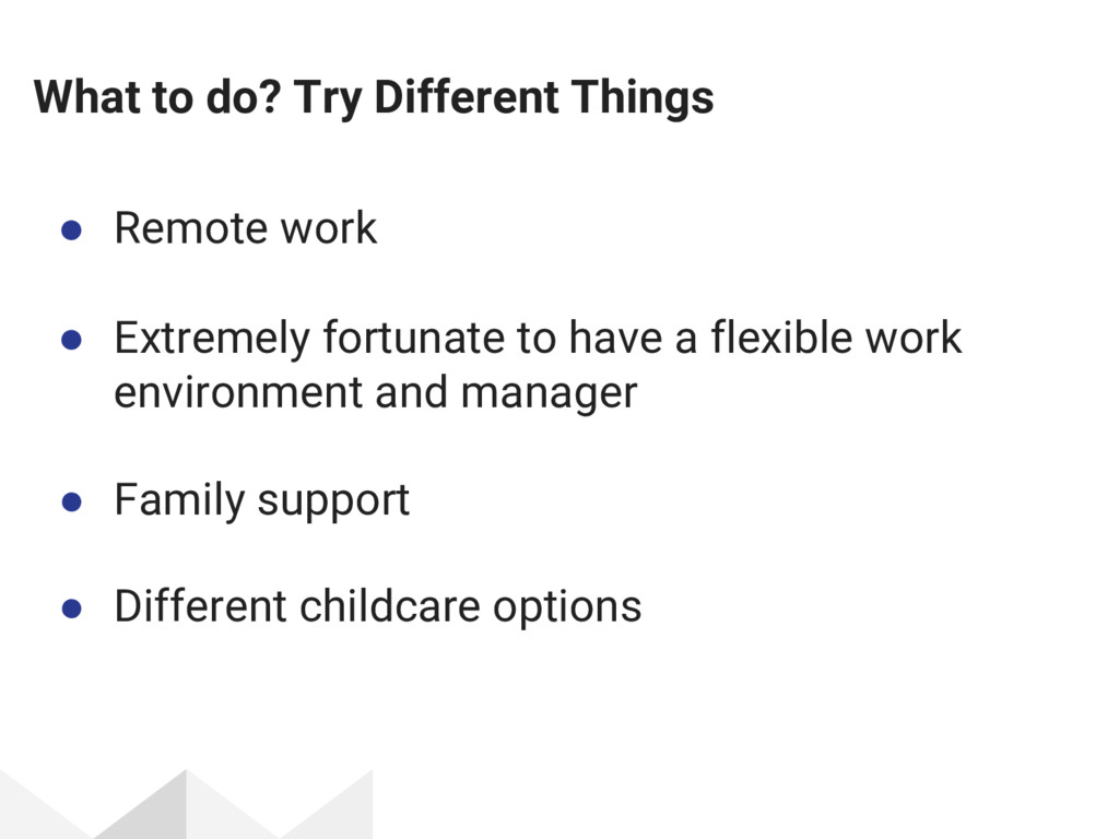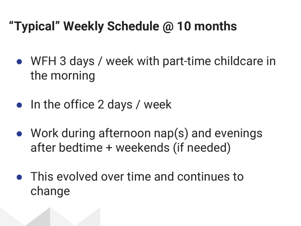 / week with part-time childcare in the morning • In the office 2 days / week • Work during afternoon nap(s) and evenings after bedtime + weekends (if needed) • This evolved over time and continues to change