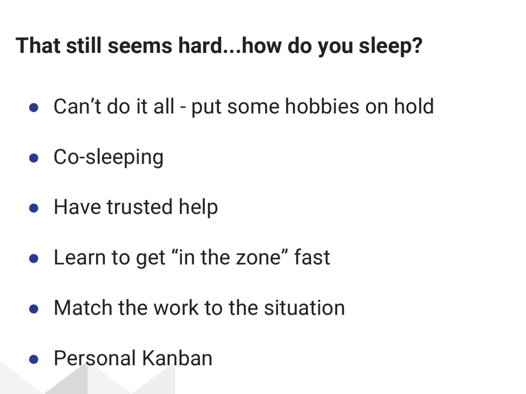 it all - put some hobbies on hold • Co-sleeping • Have trusted help • Learn to get “in the zone” fast • Match the work to the situation • Personal Kanban