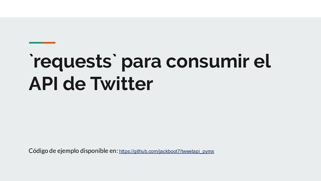 • Crear, leer, borar tweets y timelines • Manejar y obtener información pública • Seguir, buscar, y obtener usuarios Premium API ($$$) Filtrado avanzado en la búsqueda, información en tiempo real vía el Account Activity API Enterprise API ($$$) Acceso a los datos de Twitter en tiempo real, históricos. Ads API Interactuar programáticamente con la plataforma de anuncios de Twitter Twitter for Websites Introducir contenido de Twitter en tu website