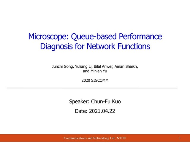 root cause of performance problem among NFs ▪ Method ▪ Take surveys on many companies ▪ Propose Microscope tool to analyze queue, without any access to NF’s code ▪ Result ▪ Diagnose the problems much more accurately than NetMedic 40 Conclusion