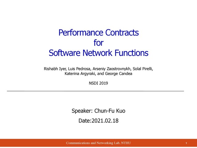 of Generating Contract ▪ Requirements ▪ Well defined separation between stateful and stateless NF code ▪ Pre-analysis library for stateful NF data structure ▪ Analyze once, reuse across NFs ▪ Appropriate PCV is the balance of precision & difficulty of use ▪ More PCVs could leak the implementation detail of the NF ▪ Developers need more detail ▪ Operators need a easy analysis approach
