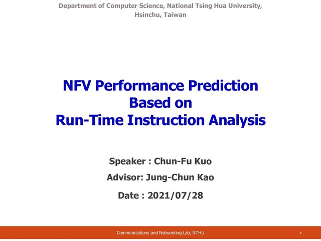 NTHU Batch Process Dequeue Process Enqueue Process PKT PKT PKT PKT PKT PKT time o NFs process packets in batch to make full use of cache and reduce overhead o Each NF has almost the same dequeue process and enqueue process o NF process flows differ from their type and configuration o So, we only have to measure the different part: packet_handler function in NFs