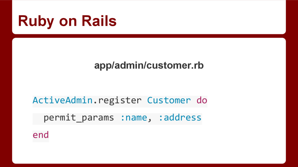 Ruby on Rails app/admin/customer.rb ActiveAdmin.register Customer do permit_params :name, :address