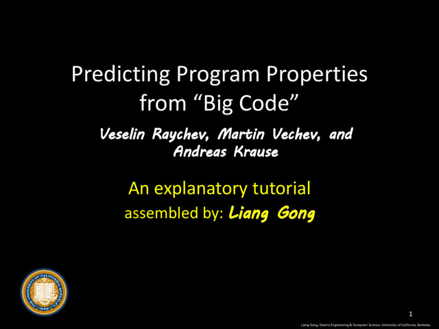by: Liang Gong Liang Gong, Electric Engineering & Computer Science, University of California, Berkeley. 1 Veselin Raychev, Martin Vechev, and Andreas Krause