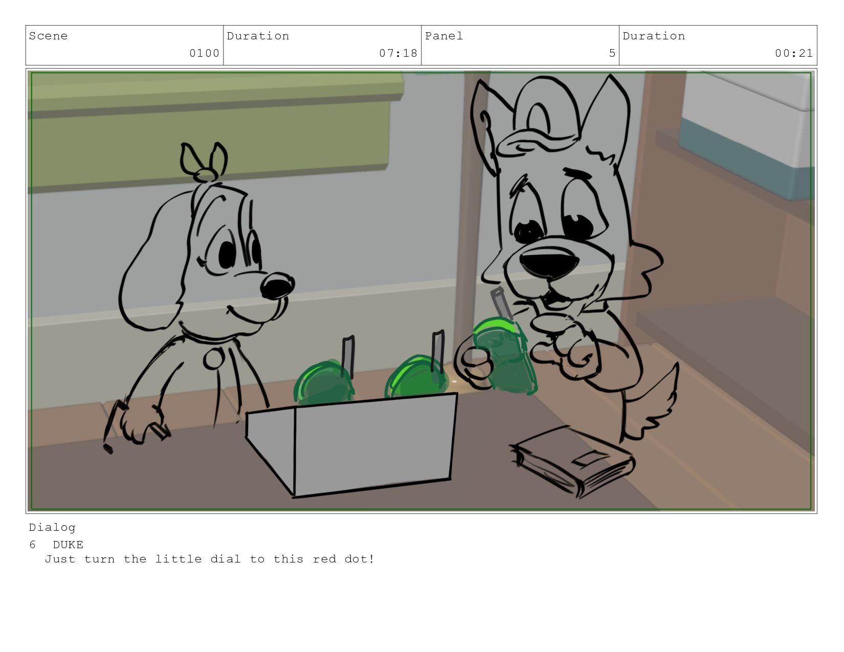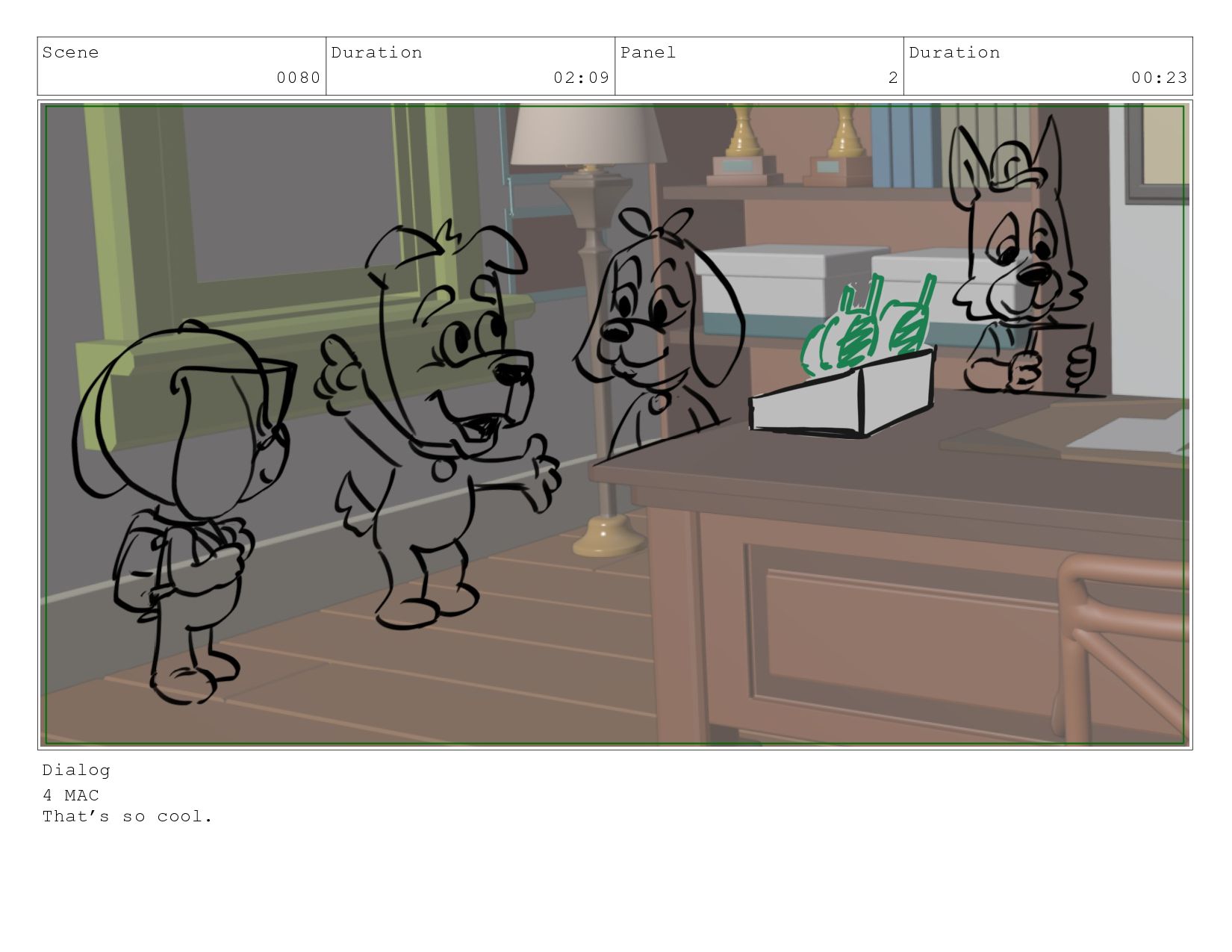 Scene 0060 Duration 05:23 Panel 2 Duration 02:08 Dialog comes