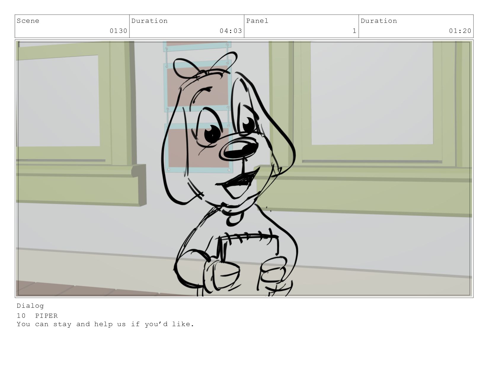 Scene 0130 Duration 04:03 Panel 1 Duration 01:20 Dialog 10