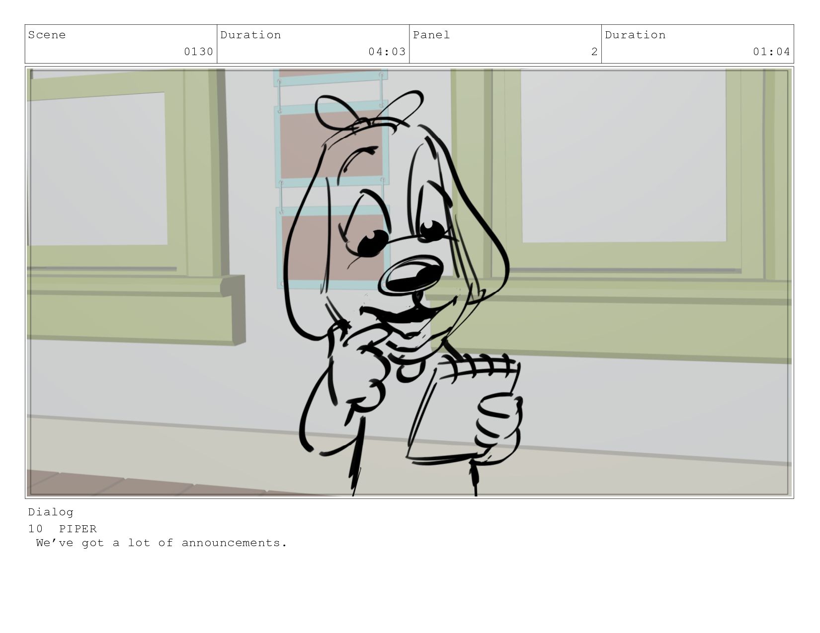 Scene 0130 Duration 04:03 Panel 2 Duration 01:04 Dialog 10