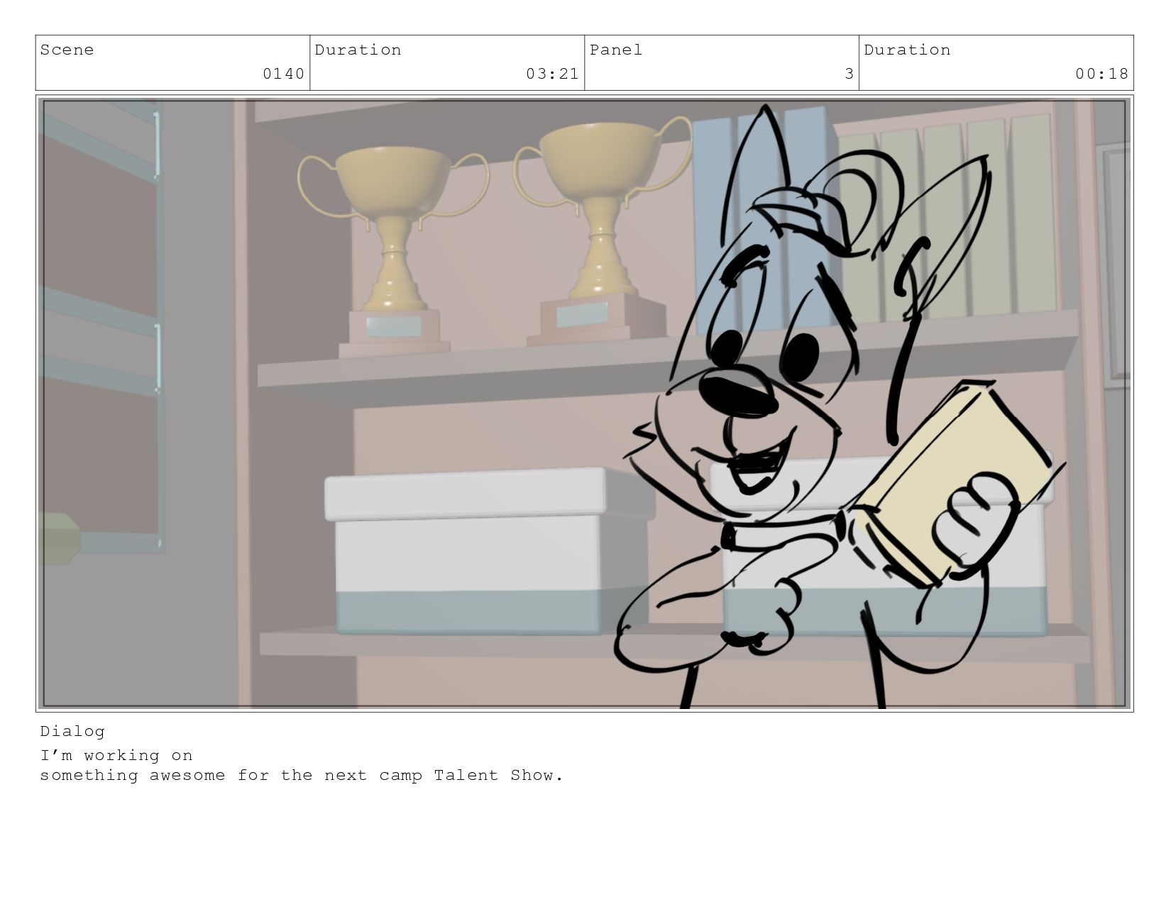 Scene 0140 Duration 03:21 Panel 3 Duration 00:18 Dialog I’m