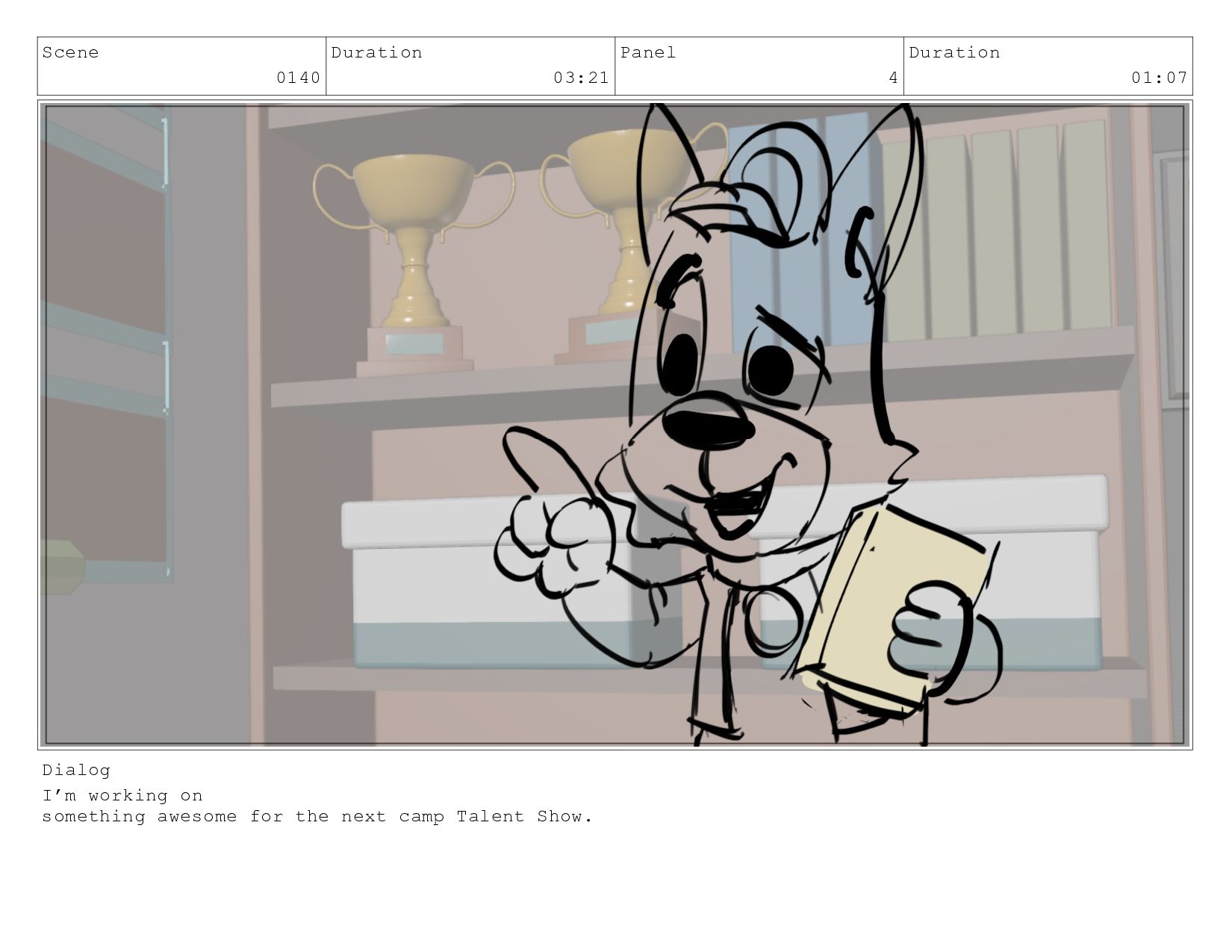Scene 0140 Duration 03:21 Panel 4 Duration 01:07 Dialog I’m