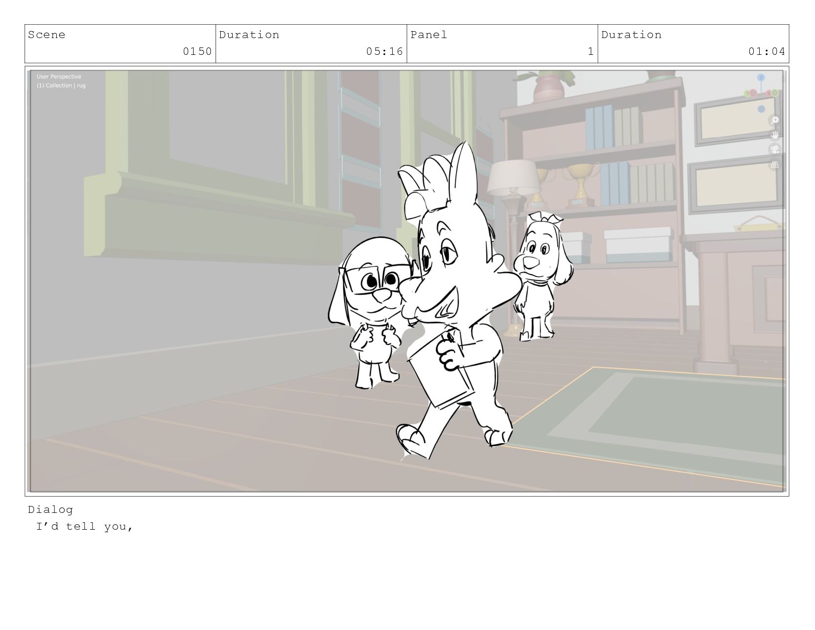 Scene 0150 Duration 05:16 Panel 1 Duration 01:04 Dialog I’d