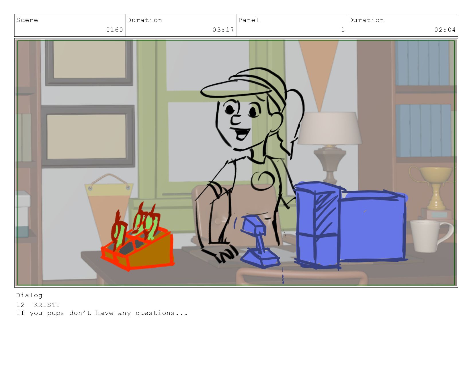 Scene 0160 Duration 03:17 Panel 1 Duration 02:04 Dialog 12