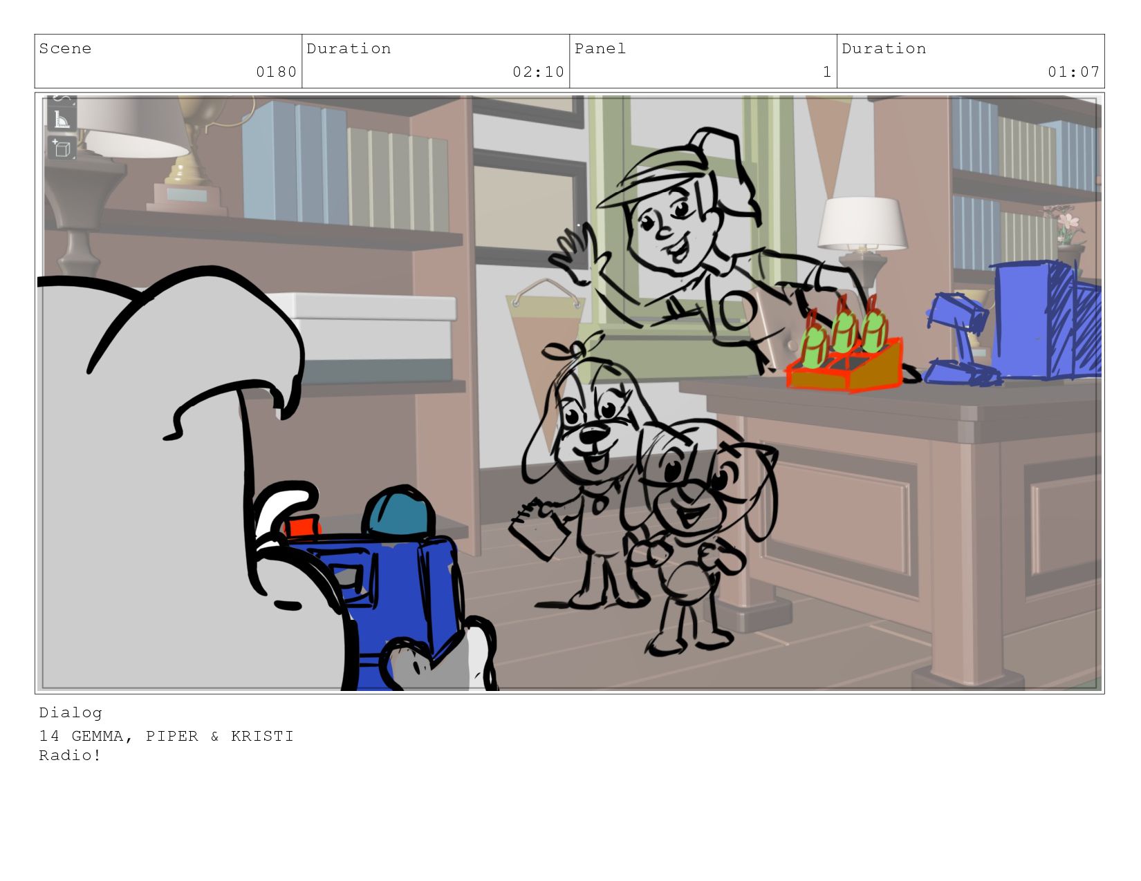 Scene 0180 Duration 02:10 Panel 1 Duration 01:07 Dialog 14