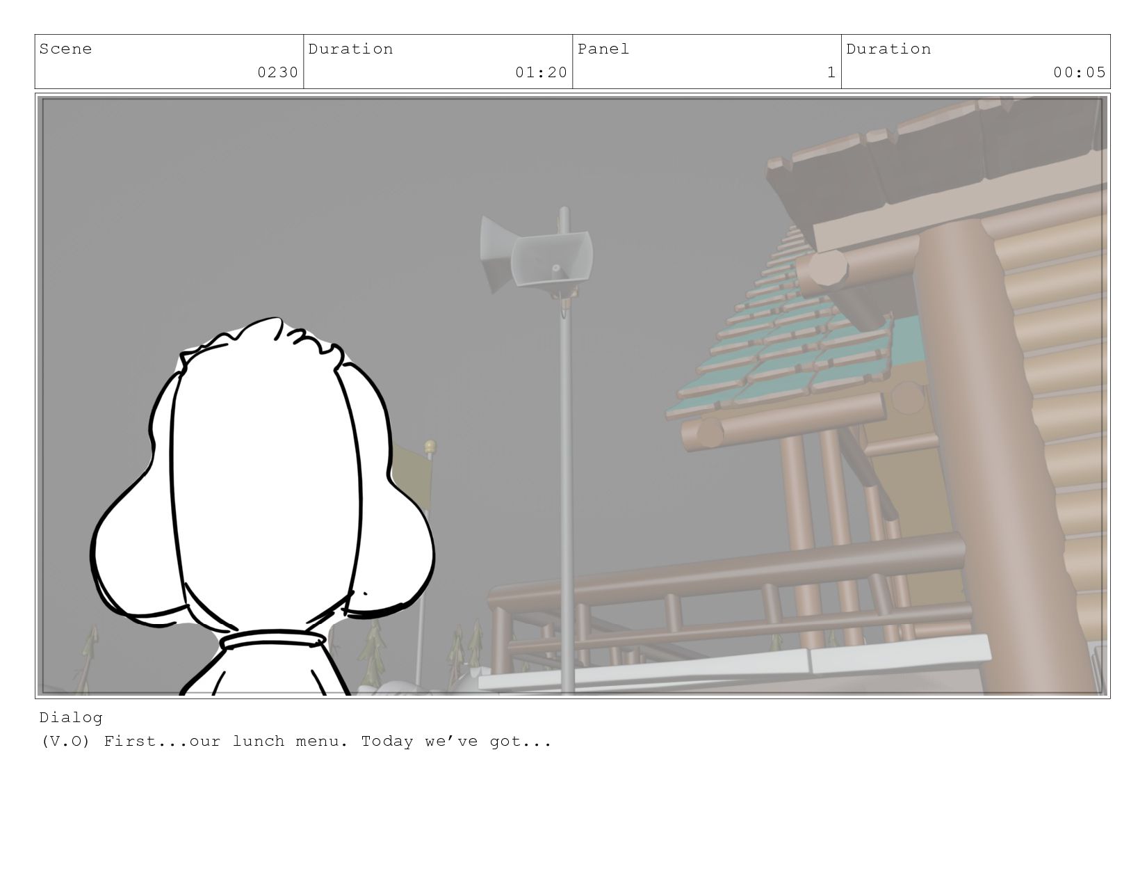 Scene 0230 Duration 01:20 Panel 1 Duration 00:05 Dialog (V.O)
