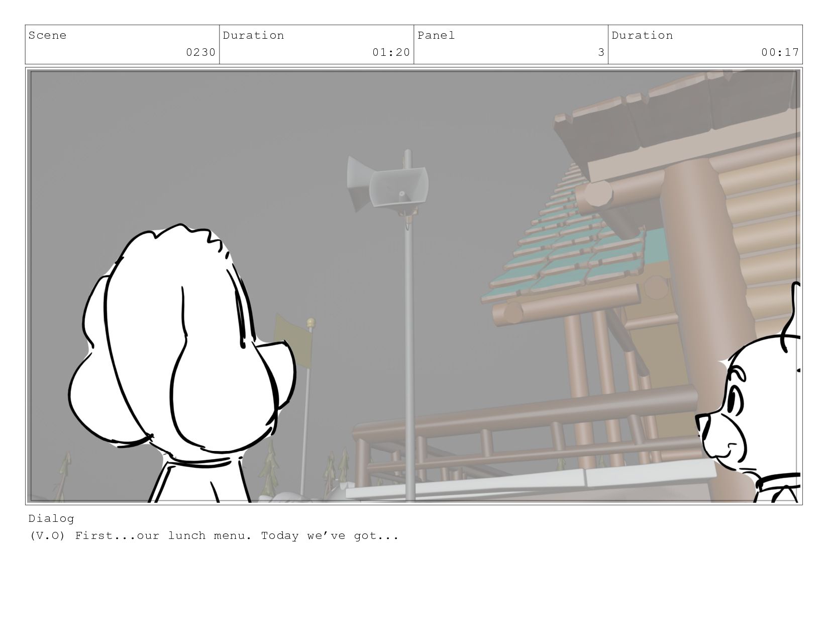 Scene 0230 Duration 01:20 Panel 3 Duration 00:17 Dialog (V.O)