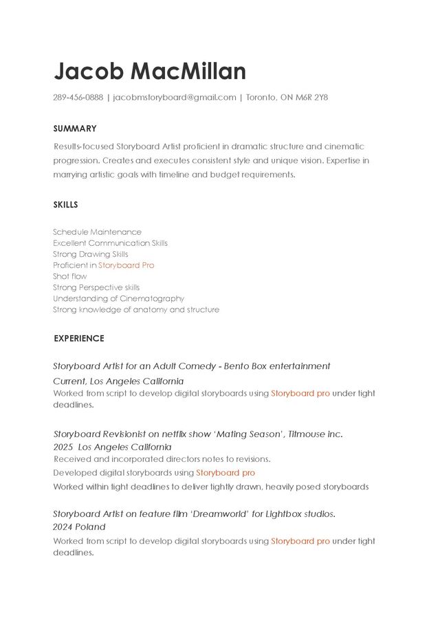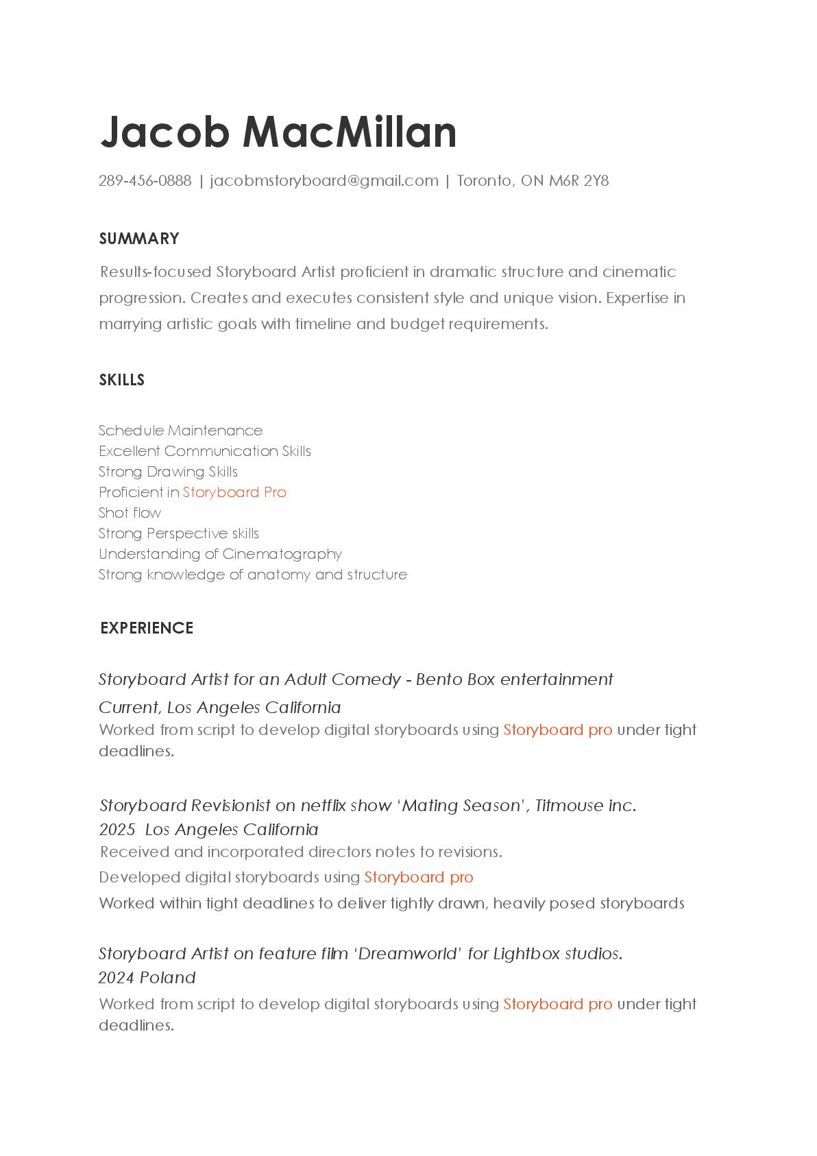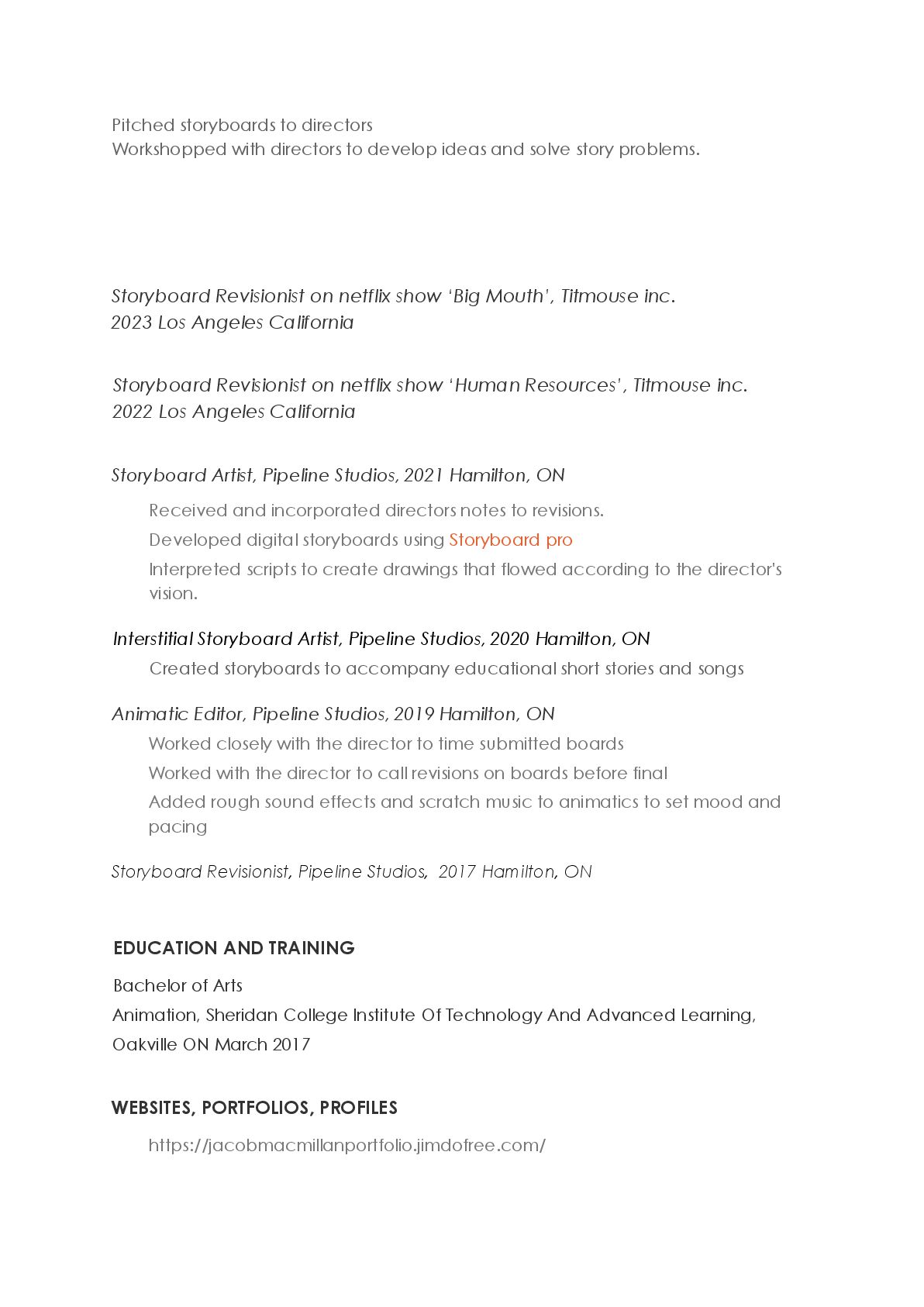 develop ideas and solve story problems. Storyboard Revisionist on netflix show ‘Big Mouth’, Titmouse inc. 2023 Los Angeles California Storyboard Revisionist on netflix show ‘Human Resources’, Titmouse inc. 2022 Los Angeles California Storyboard Artist, Pipeline Studios, 2021 Hamilton, ON Received and incorporated directors notes to revisions. Developed digital storyboards using Storyboard pro Interpreted scripts to create drawings that flowed according to the director's vision. Interstitial Storyboard Artist, Pipeline Studios, 2020 Hamilton, ON Created storyboards to accompany educational short stories and songs Animatic Editor, Pipeline Studios, 2019 Hamilton, ON Worked closely with the director to time submitted boards Worked with the director to call revisions on boards before final Added rough sound effects and scratch music to animatics to set mood and pacing Storyboard Revisionist, Pipeline Studios, 2017 Hamilton, ON EDUCATION AND TRAINING Bachelor of Arts Animation, Sheridan College Institute Of Technology And Advanced Learning, Oakville ON March 2017 WEBSITES, PORTFOLIOS, PROFILES https://jacobmacmillanportfolio.jimdofree.com/