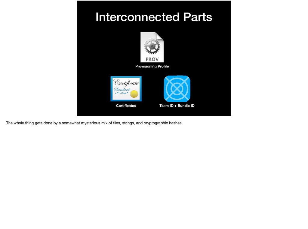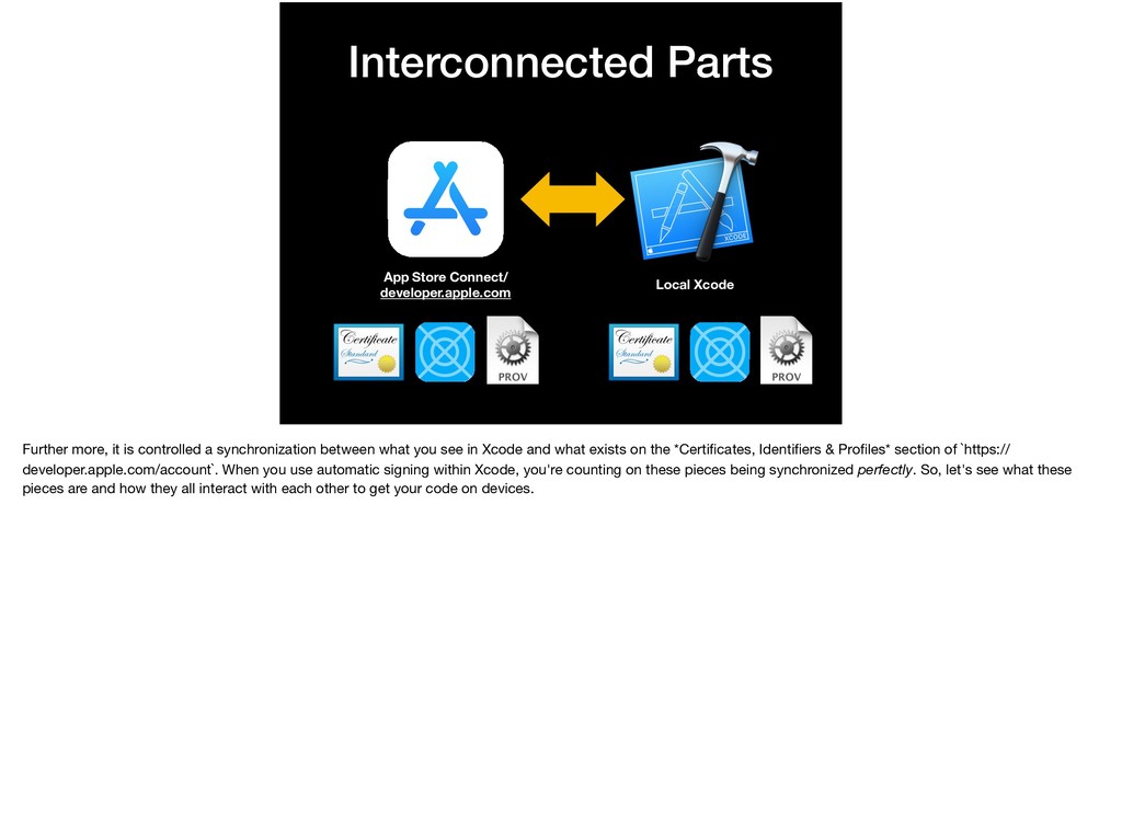it is controlled a synchronization between what you see in Xcode and what exists on the *Certificates, Identifiers & Profiles* section of `https:// developer.apple.com/account`. When you use automatic signing within Xcode, you're counting on these pieces being synchronized perfectly. So, let's see what these pieces are and how they all interact with each other to get your code on devices.