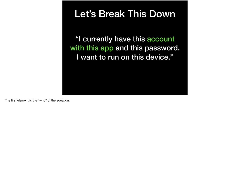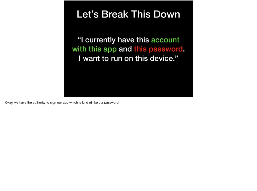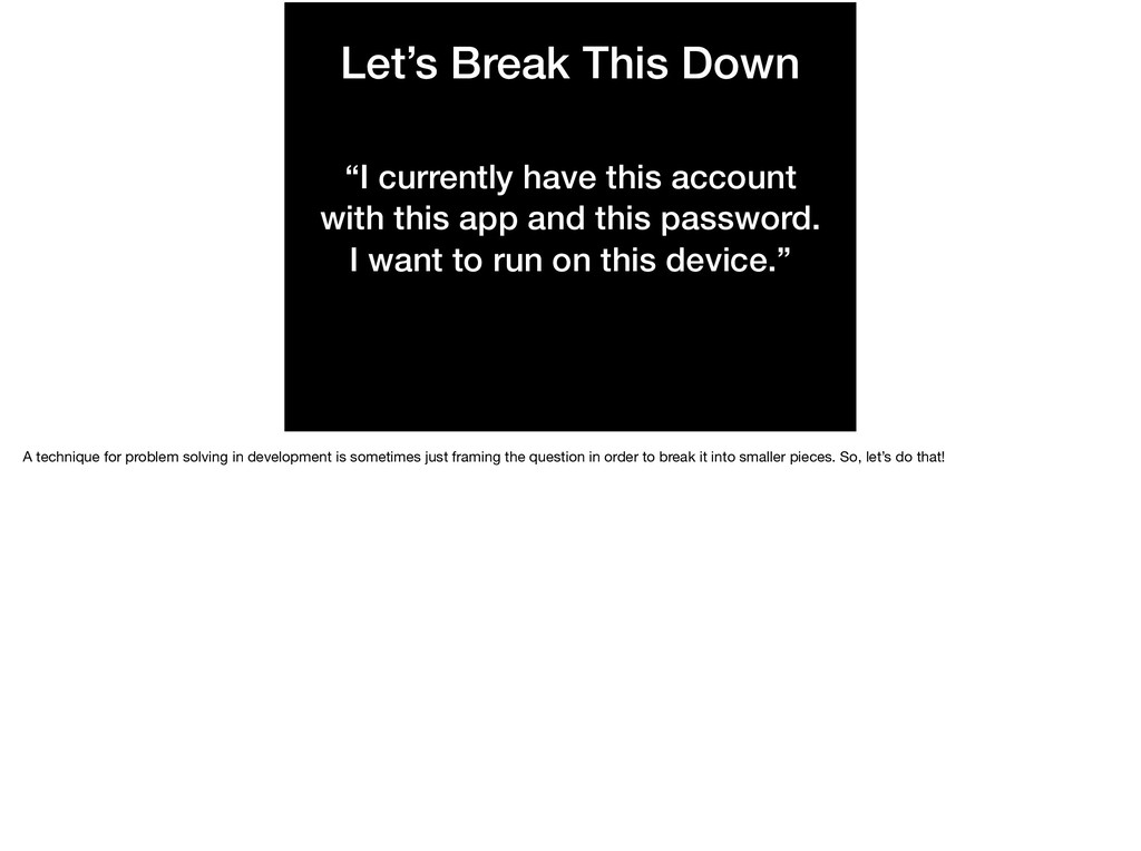 this app and this password. I want to run on this device.” A technique for problem solving in development is sometimes just framing the question in order to break it into smaller pieces. So, let’s do that!
