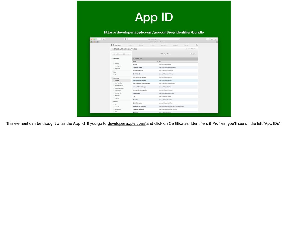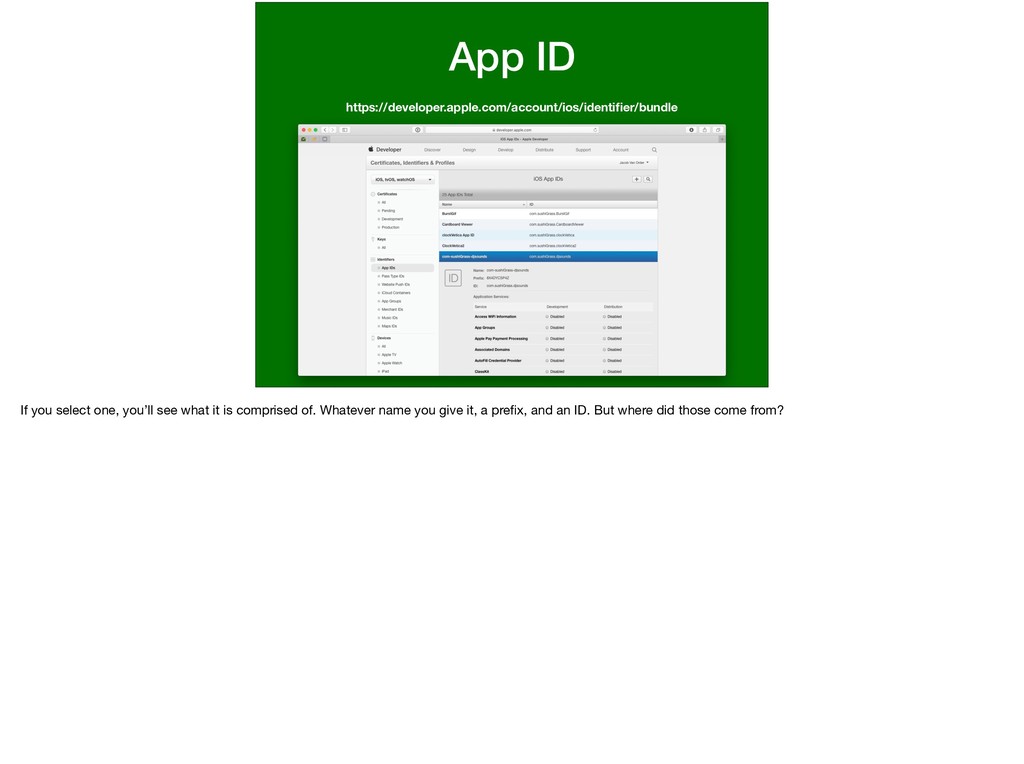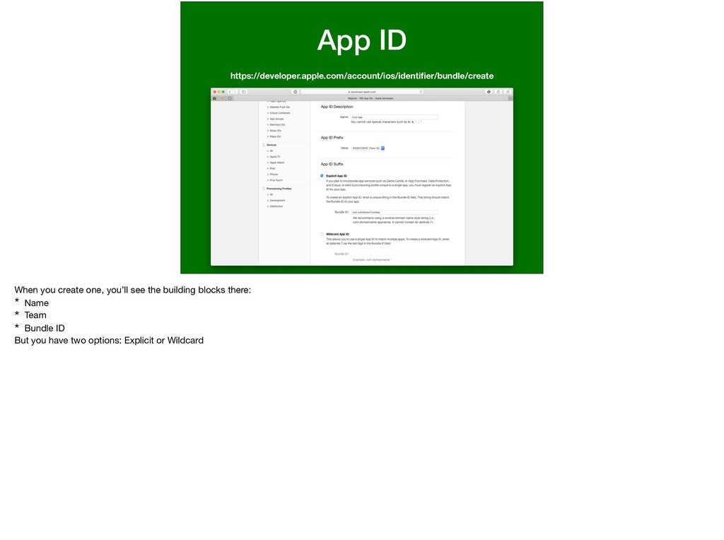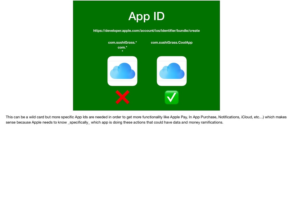 can be a wild card but more specific App Ids are needed in order to get more functionality like Apple Pay, In App Purchase, Notifications, iCloud, etc…) which makes sense because Apple needs to know _specifically_ which app is doing these actions that could have data and money ramifications.