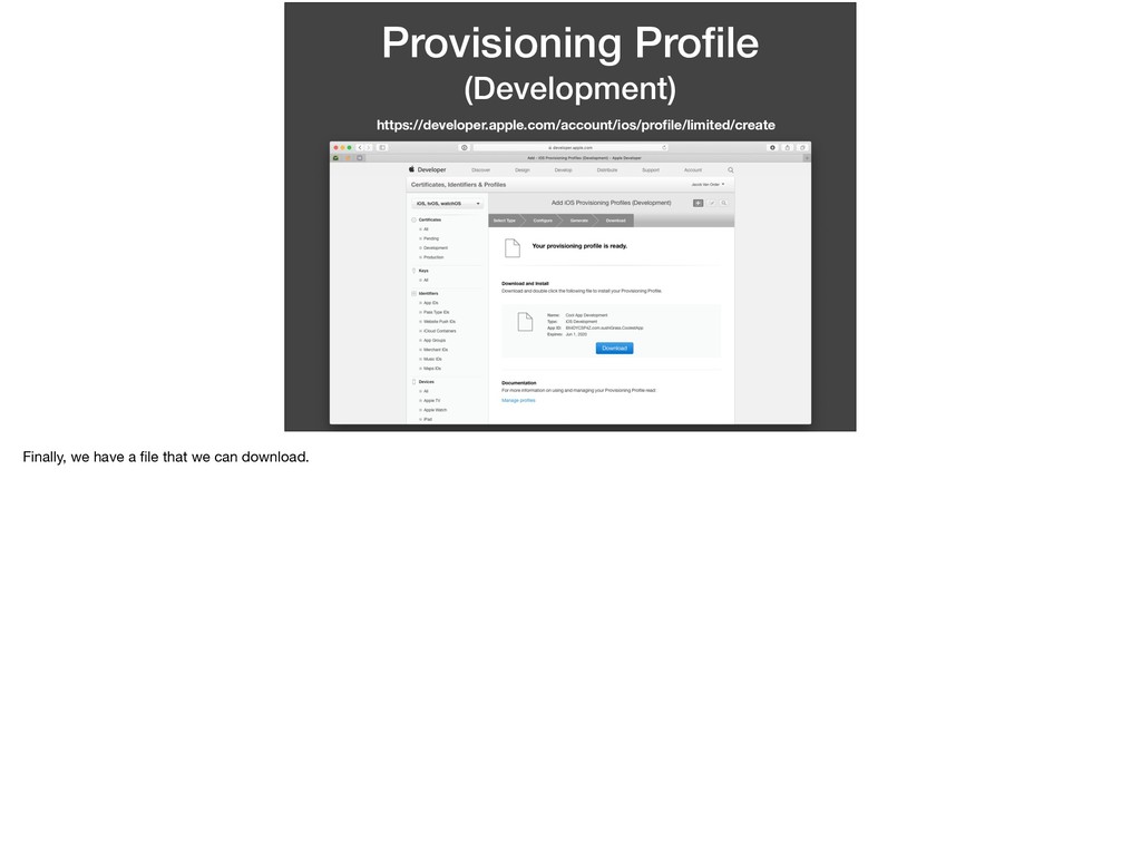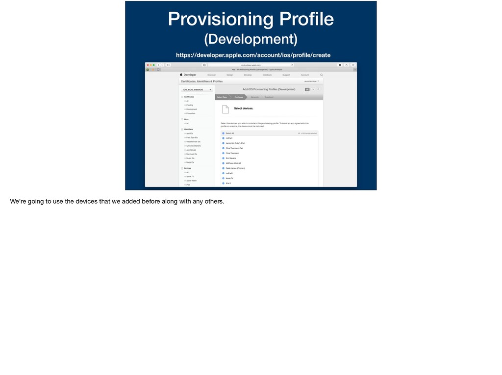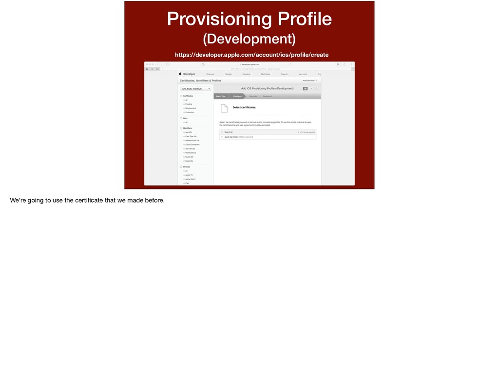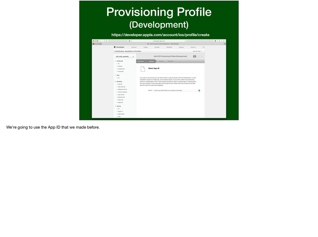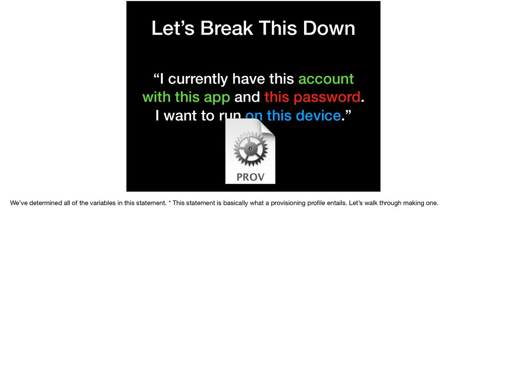 this app and this password. I want to run on this device.” We’ve determined all of the variables in this statement. * This statement is basically what a provisioning profile entails. Let’s walk through making one.