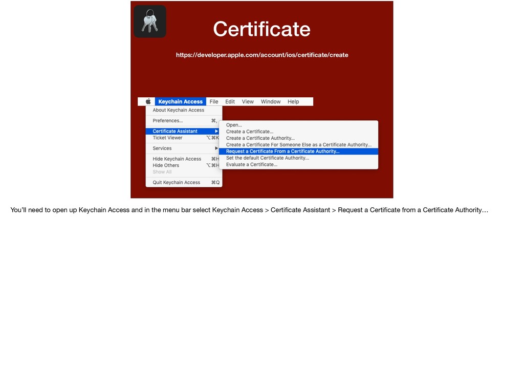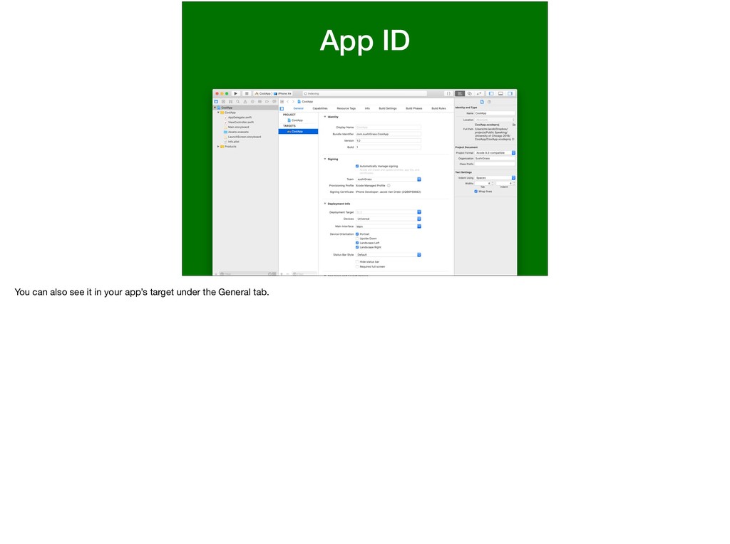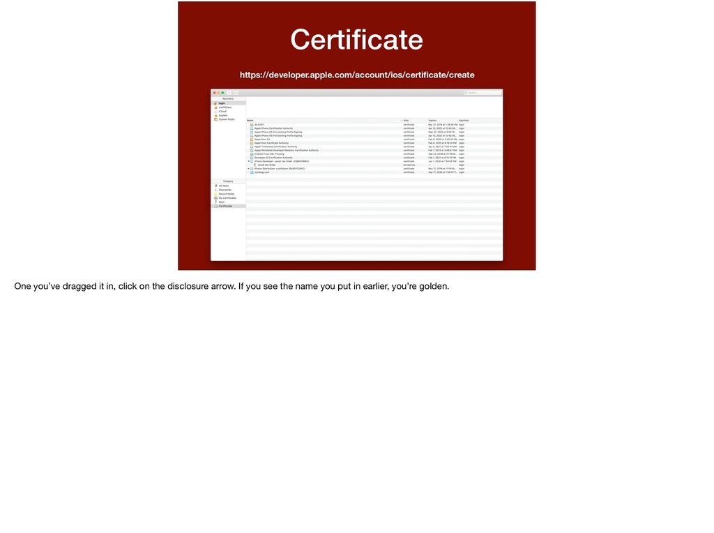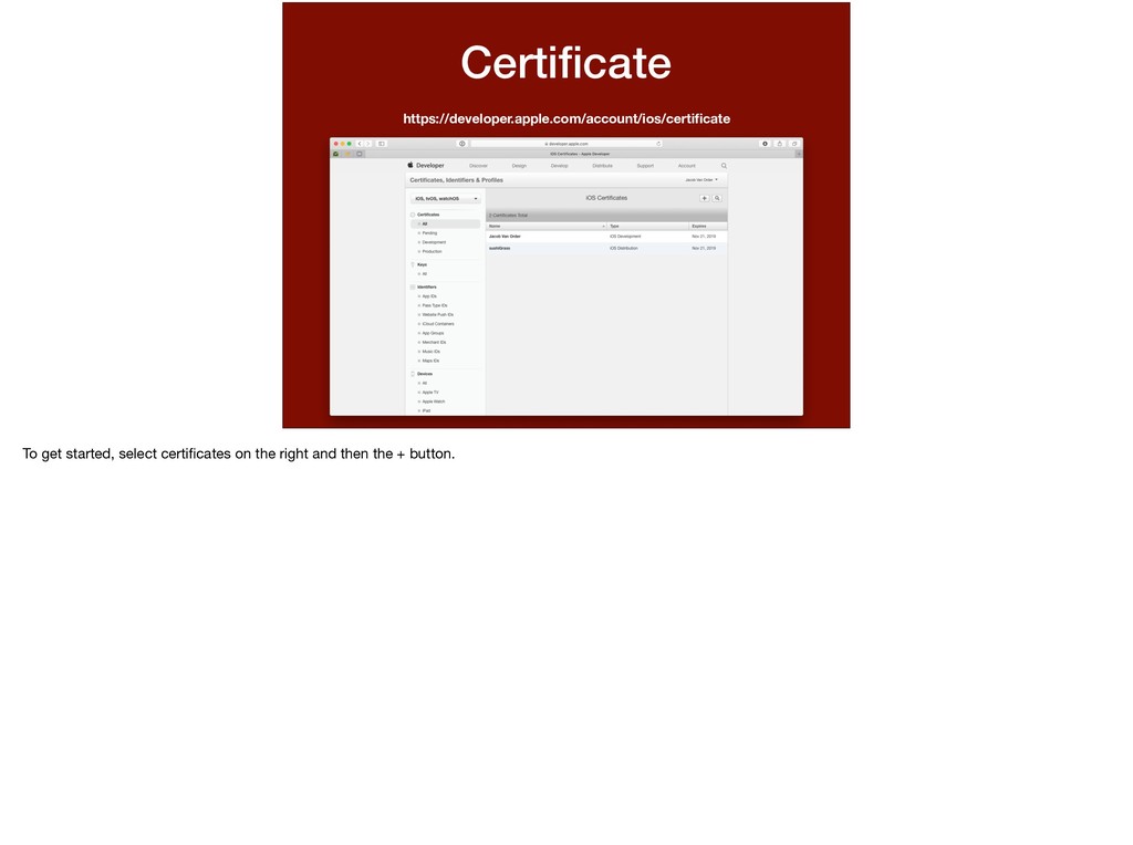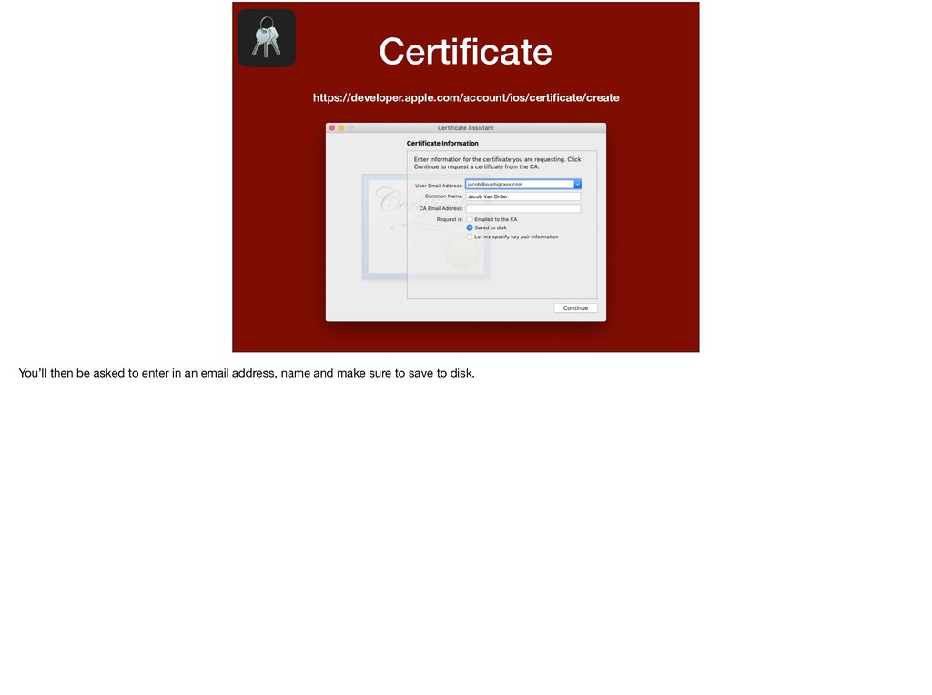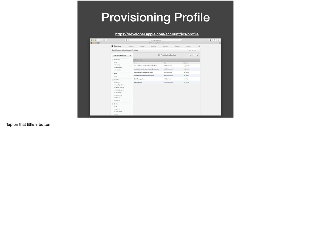this app and this password. I want to run on this device.” We’ve determined all of the variables in this statement. * This statement is basically what a provisioning profile entails. Let’s walk through making one.